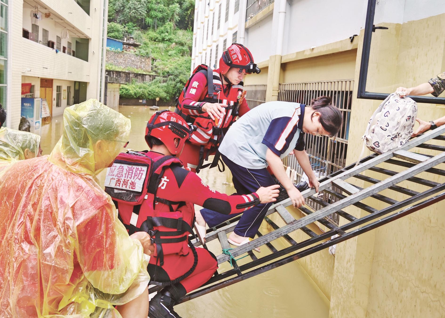 6月23日,救援人员在广西天峨县民族中学转移学生。受持续强降雨影响,广西天峨县民族中学出现内涝,400多名初三学生及30名教师受困校内。据了解,该校为2025年中考考点,为确保考生安全及考试顺利进行,当地将受困学生紧急转移至备用考点天峨县高级中学。新华社发 敖雪莲 摄