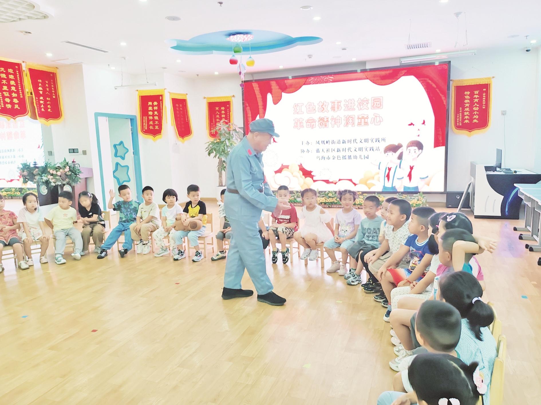 7月2日,海勃湾区凤凰岭街道联合蓝天社区邀请“红骑兵”宣讲团走进金色摇篮幼儿园,开展“红色故事进校园,革命精神润童心”主题宣讲活动,向孩子们讲述长征故事,与他们共同学习长征精神。 (张楚研 摄)