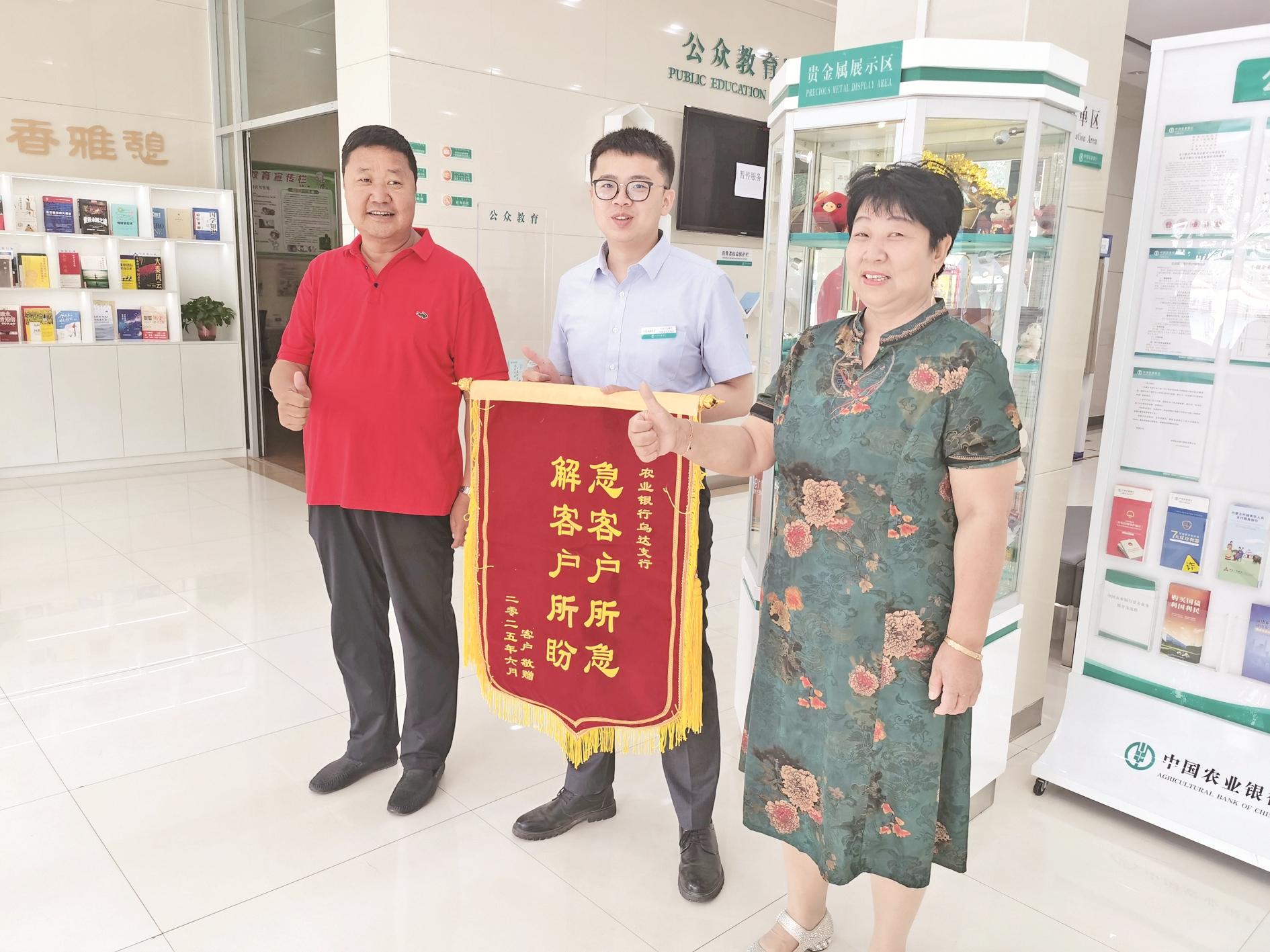 6月25日,农行乌海分行乌达支行收到一面锦旗,上面用金色大字写着“解客户所盼,急客户所急”,充分体现了农行对待客户认真且负责的精神。