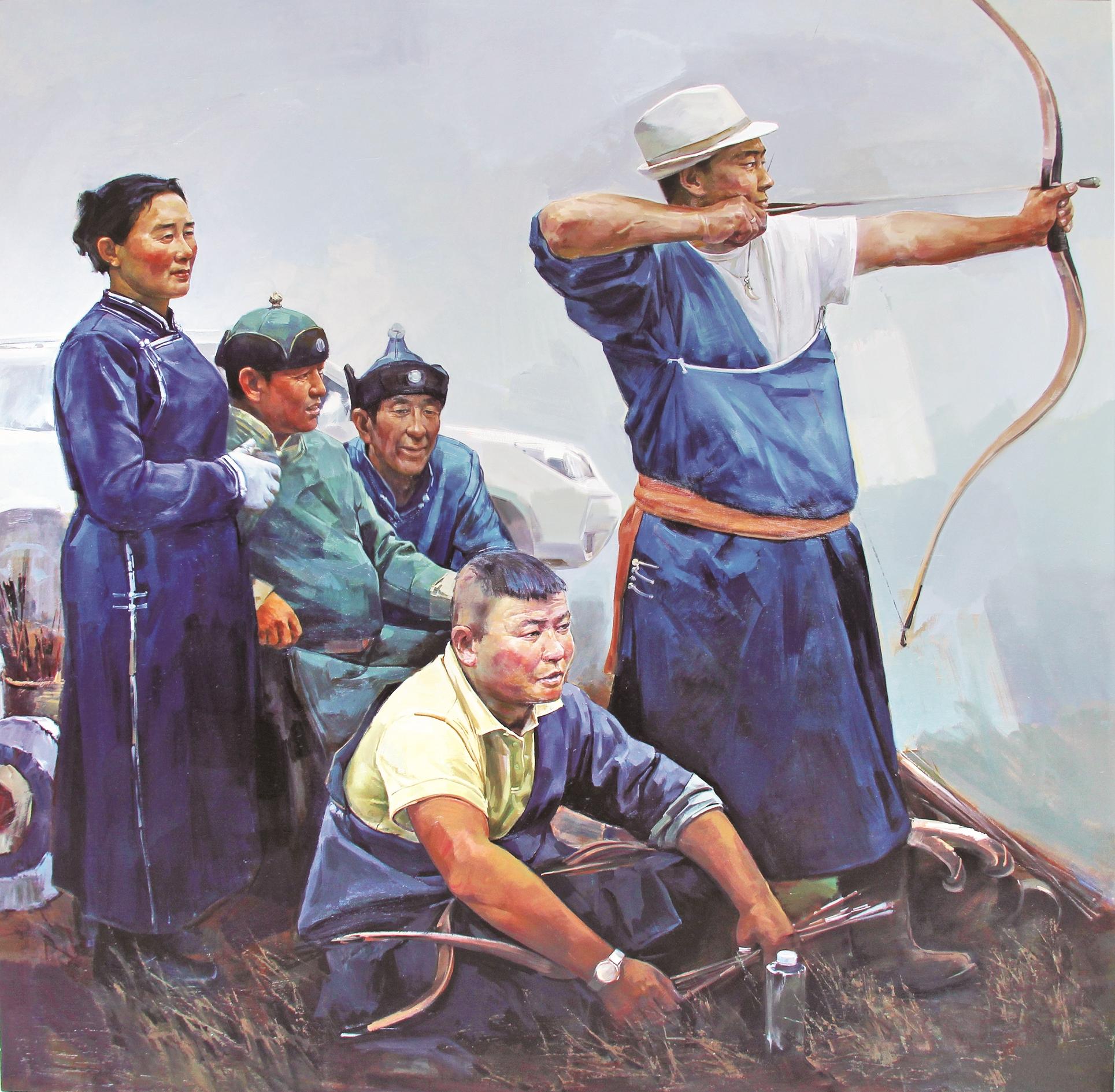 近两年,张兆龙的生活愈发像油画般多姿多彩,小店的生意越来越好,他的油画作品也常常外出参展,获得诸多优秀成绩。2023年,他与市美术家协会一起去鄂托克草原采风,他在这里看到了射箭手的风采,萌生了创作念头。他用相机记录了那一瞬间,作为他创作《激情草原》时的原始素材,之后构思、创作,用一年的时间完成了这幅作品。这幅《激情草原》在2024年入选了悲鸿风度——第二届全国油画双年展。
