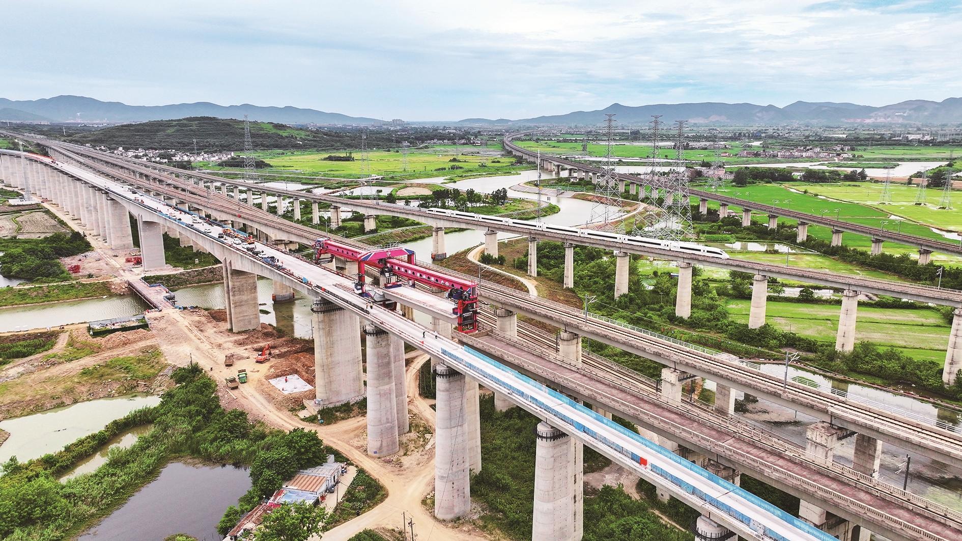 中铁四局施工机械在巢马城际铁路最后一榀箱梁架设现场作业(7月8日摄,无人机照片)。当日,随着最后一榀长32.6米、重431.75吨的箱梁精准架设至预定位置,标志着巢马城际铁路全线箱梁架设完成,为无砟轨道施工和全线按期通车奠定坚实基础。巢马城际铁路是国家“八纵八横”高铁网沪汉蓉快速通道合肥至上海间的重要组成部分,设计时速350公里。