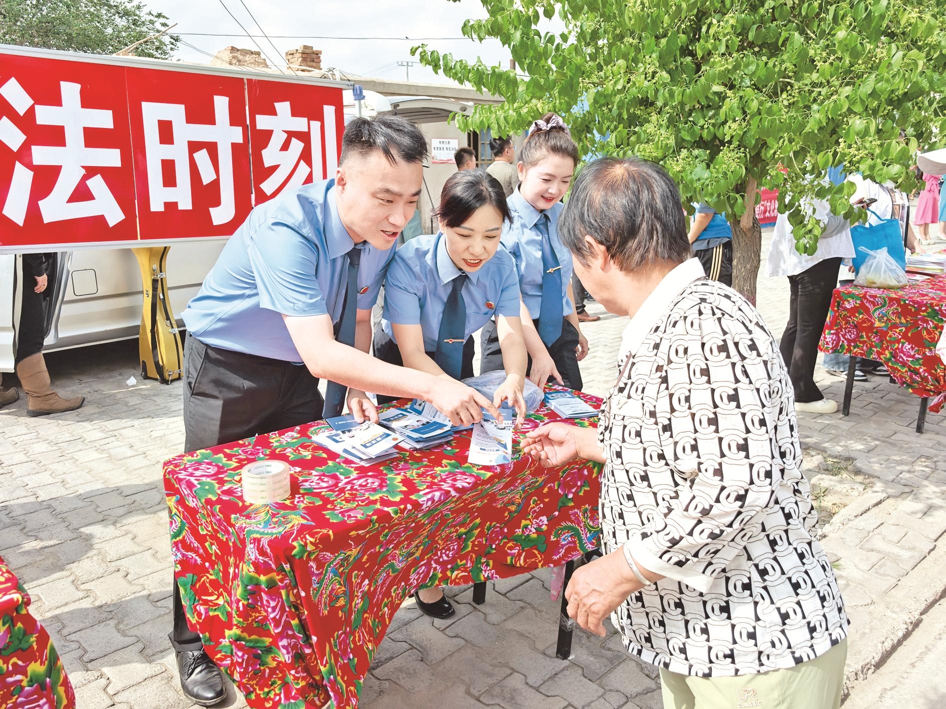 近日,乌达区人民检察院在乌兰淖尔镇富民社区搭建了小摊,开展“普法时刻”,为现场群众解读法律条文。(张丽阳 摄)
