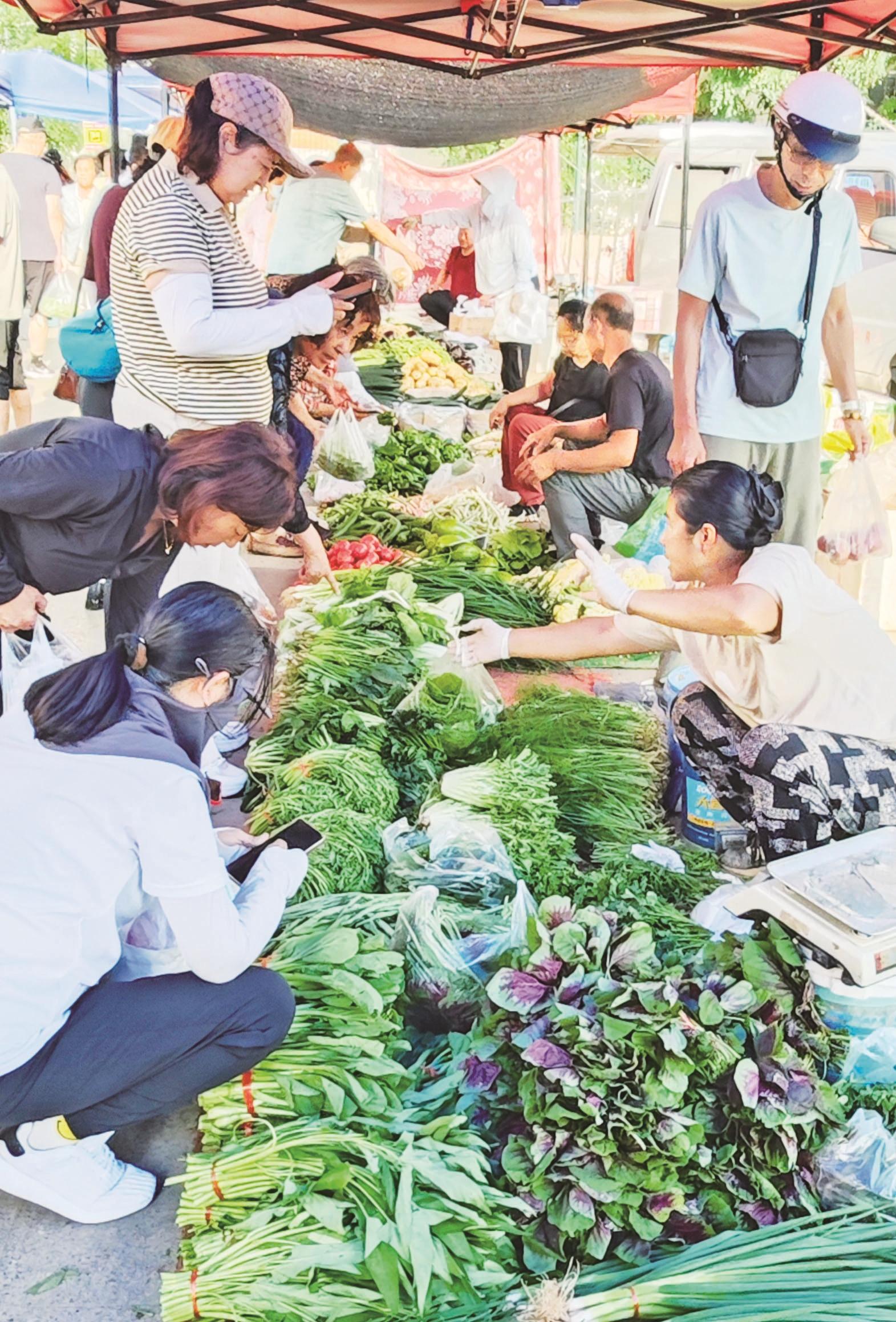 夏日的早市里,菜摊摊主牛丽梅就已经摆放好新鲜的蔬菜,泡沫箱里的黄瓜顶着嫩黄的花,筐里的西红柿还带着露珠,“这些菜都是半夜起来从地里现摘的,你看看这黄瓜顶花带刺的,多新鲜。我已经在这个早市摆了十来年摊了,人们还是很认可我家的蔬菜,就是累点也觉得挺高兴的。”她热情地招呼着前来买菜的市民,过秤、算账,干脆利落,一看就有着丰富的卖菜经验。