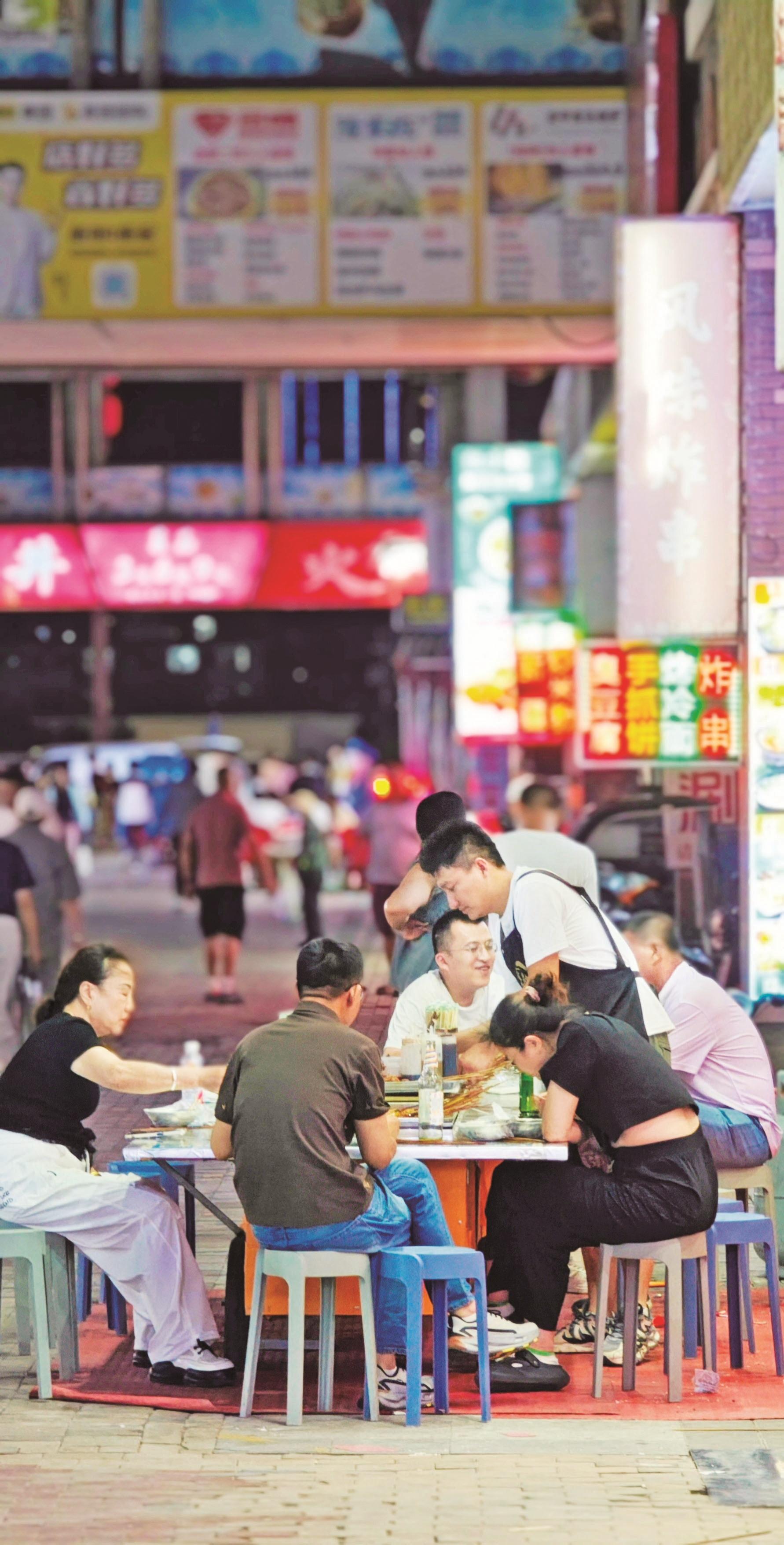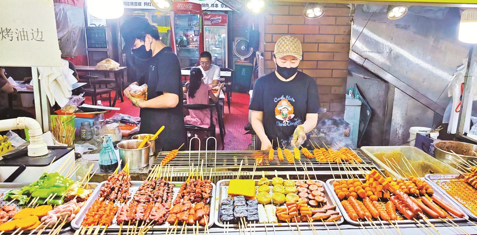 炭火上的羊肉串嗞嗞作响,油脂滴落,迸出金色火花,散发出诱人的香气。客人围坐在塑料小桌旁,手里拿着冰镇啤酒,碰杯传出清脆的响声……这里没有高档餐厅的拘谨,只有朋友相聚的欢乐和大口吃肉的畅快。大学生徐瑞虹放暑假后,经常和朋友来夜市消暑。“我们几个没事就来万达金街转一转,天太热了,待在家里也闷,而且夜市里的这些小吃我们都比较喜欢,没事几个人喝几瓶啤酒,聊一聊天,感觉还是很惬意的。”对于年轻人来说,夜市不仅是美食的聚集地,更是释放压力、享受生活的好去处。在这里,他们可以暂时抛开烦恼,尽情享受美食带来的快乐。