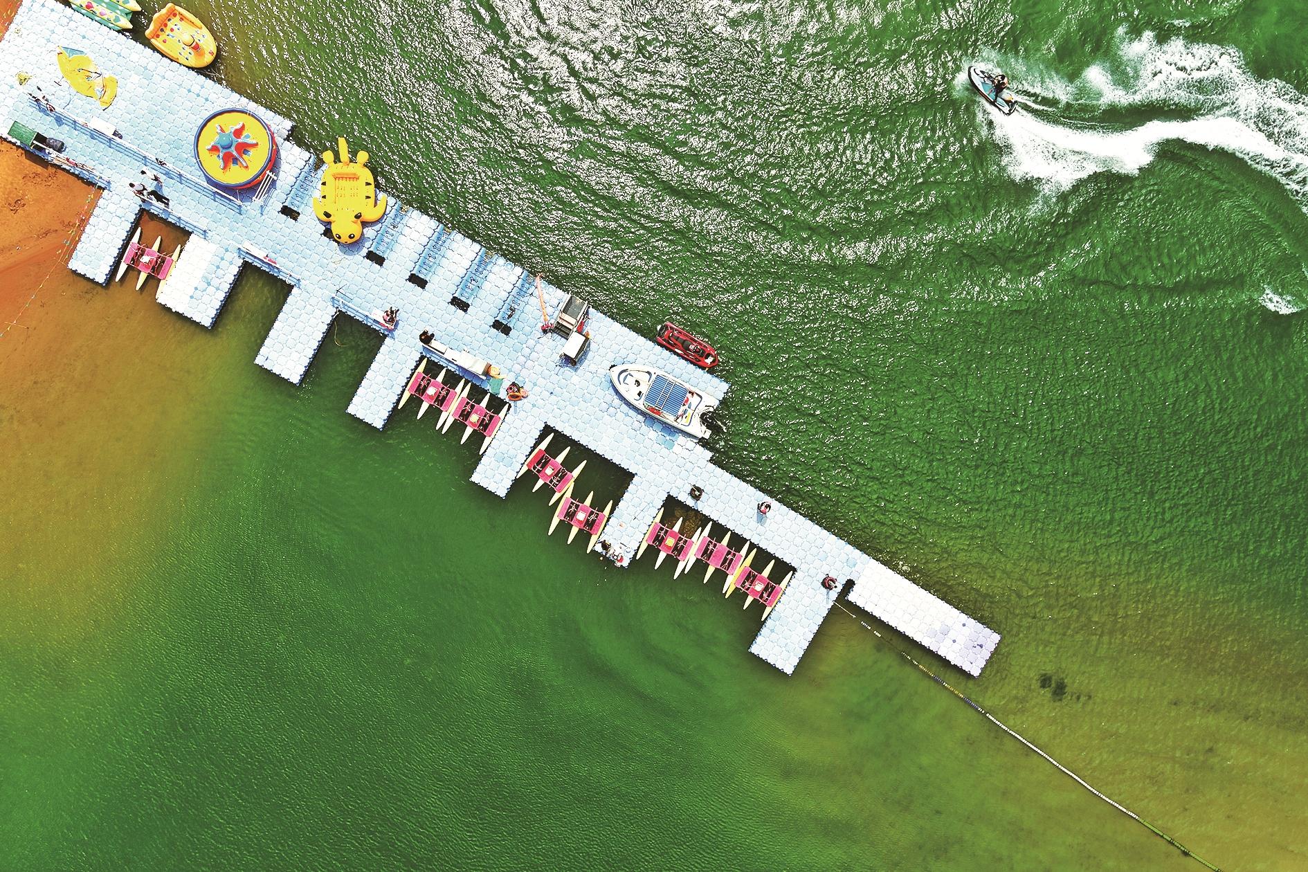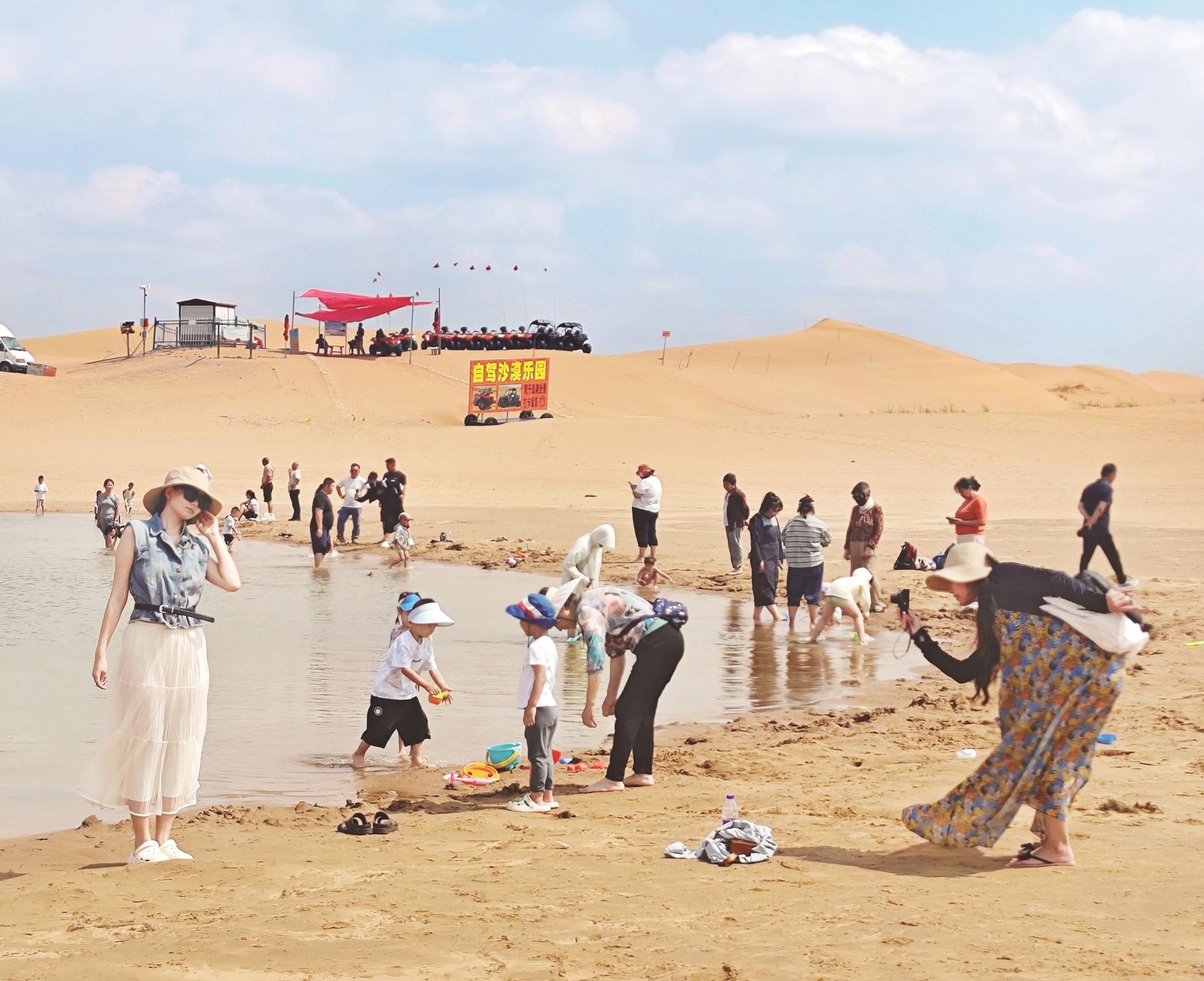 暑期,我市迎来旅游旺季,各景区景点游客如织,文旅市场消费旺盛。图为7月21日,乌海湖休闲度假旅游区风景如画,游客在打卡游玩。(王超 摄)