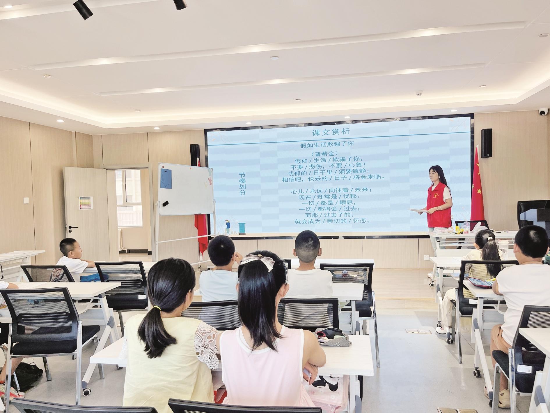 近日,海勃湾区海北街道黄河社区的暑期“青苗学社”五彩公益课堂招募在校大学生为辅导老师,链接辖区口才班、书法班等资源,为孩子们的暑期生活增添了绚丽多彩的一笔。 (斯琴满都海 摄)