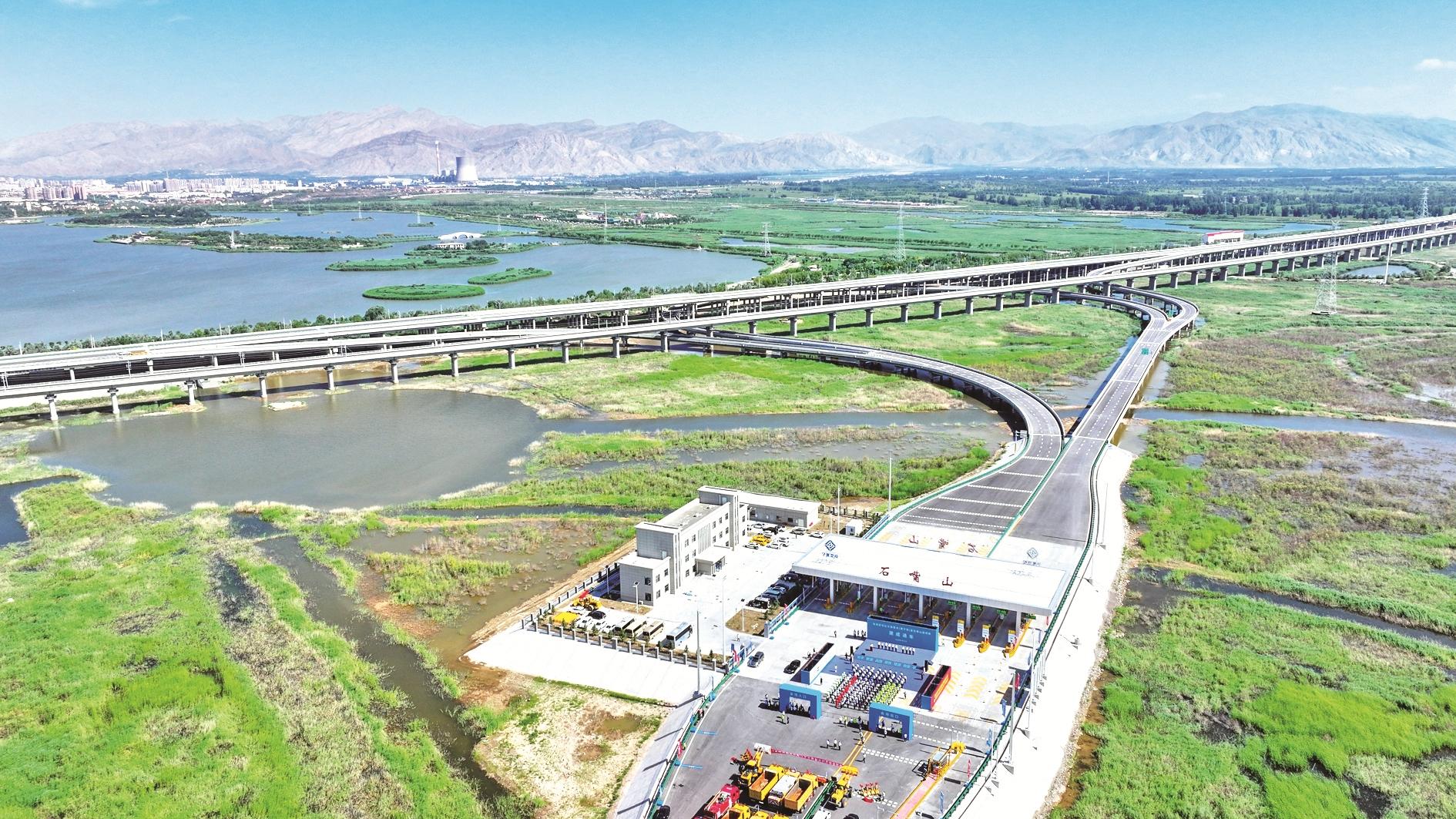 这是乌玛高速公路惠农至石嘴山段建成通车仪式现场。当日,乌玛(内蒙古乌海市至青海玛沁县)高速公路惠农(蒙宁界)至石嘴山段建成通车,标志着乌玛高速公路宁夏段全线贯通。乌玛高速公路宁夏段全长360公里,是国家高速公路网荣乌(山东荣成市至内蒙古乌海市)高速公路的重要联络线。乌玛高速惠农至石嘴山段全长57公里,概算投资56亿元,采用双向四车道高速公路标准建设。目前,宁夏公路总里程达3.9万公里,高速公路通车里程突破2400公里,国省干线网持续完善,农村公路基础网通乡达村,路网韧性持续增强。新华社记者 冯开华 摄