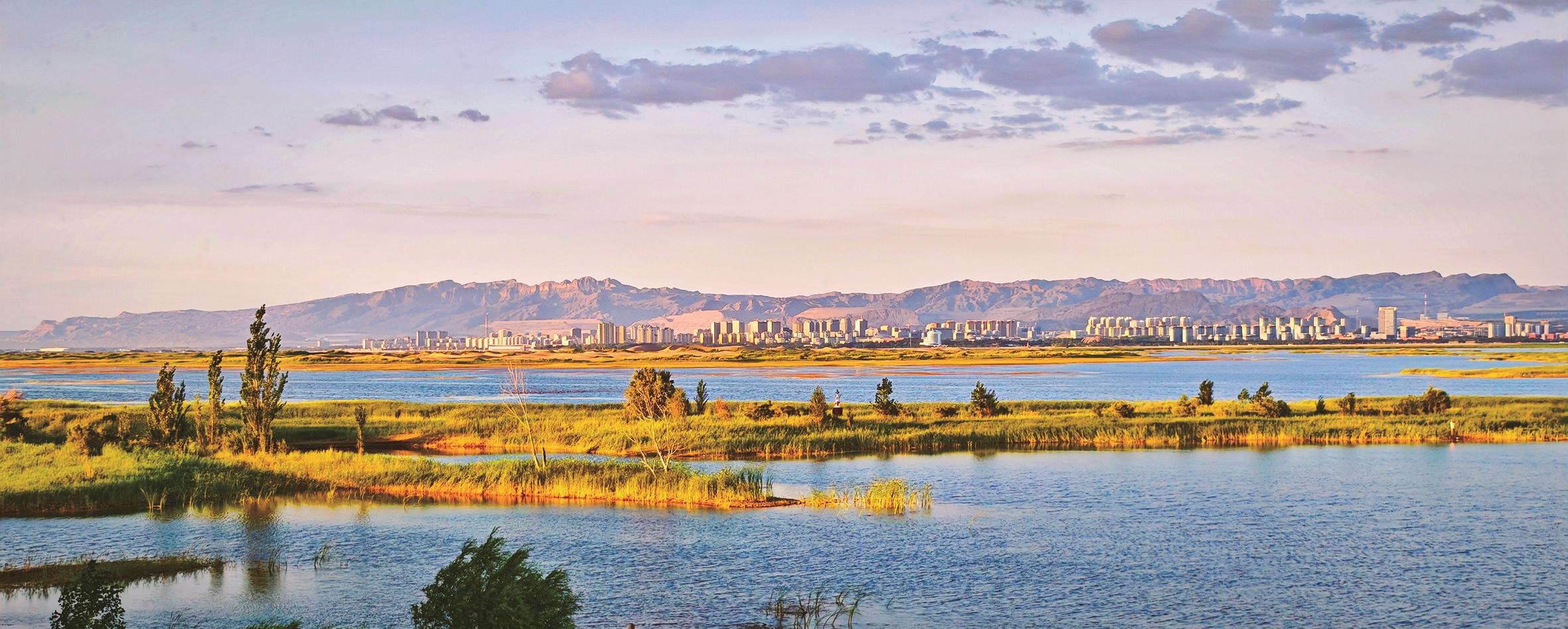 傍晚,如镜般的乌海湖水面倒映着海勃湾城区轮廓与远处山峦。在波光粼粼的湖水间,湿地草色葱茏,城市建筑在余晖中渐次铺展,勾勒出一幅生态与城市和谐共生的动人画卷,尽显独特的塞上湖城之美 。 (赵政宇 摄)