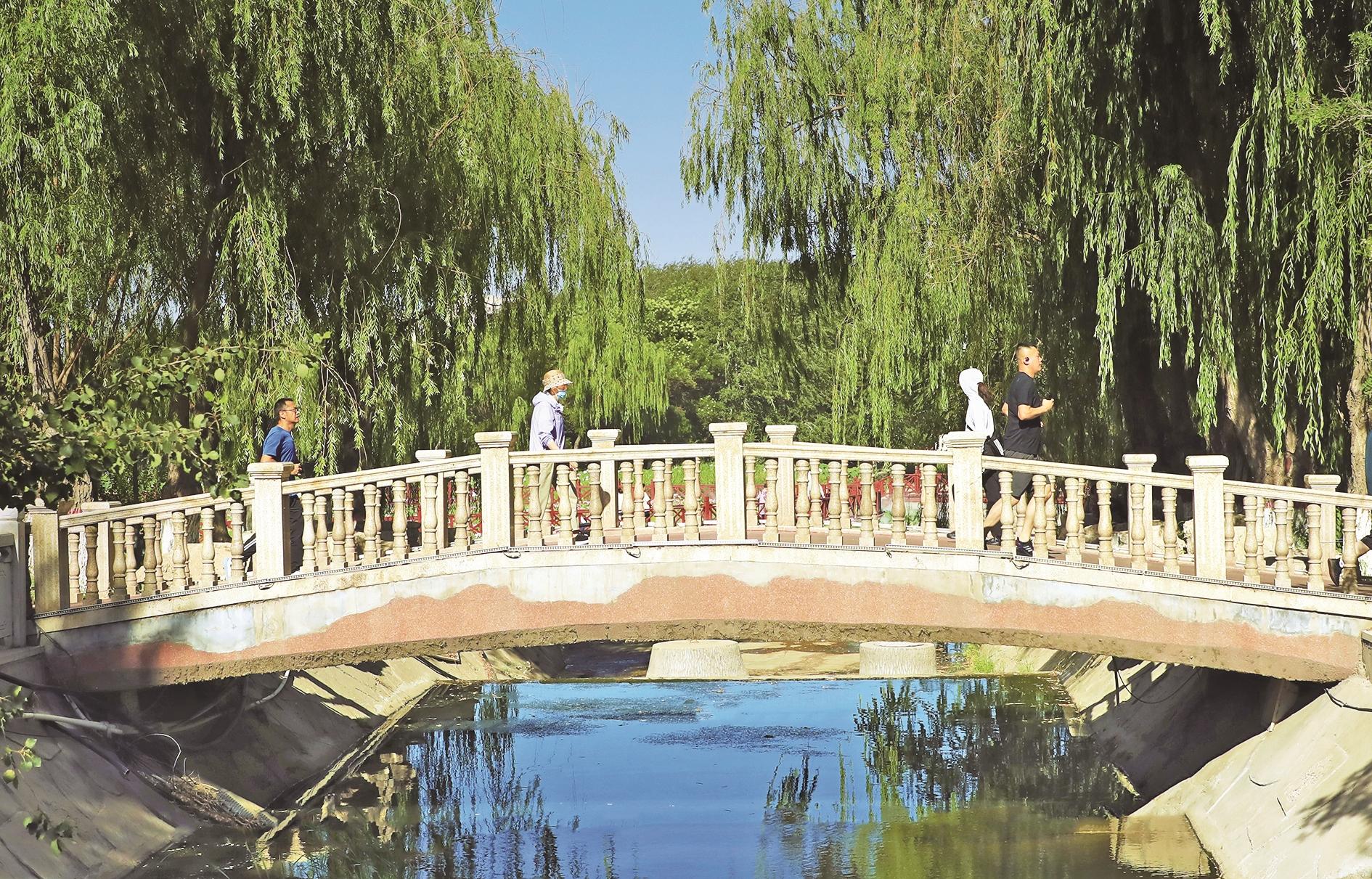 市人民公园内的柳荫长桥美景。(赵政宇 摄)