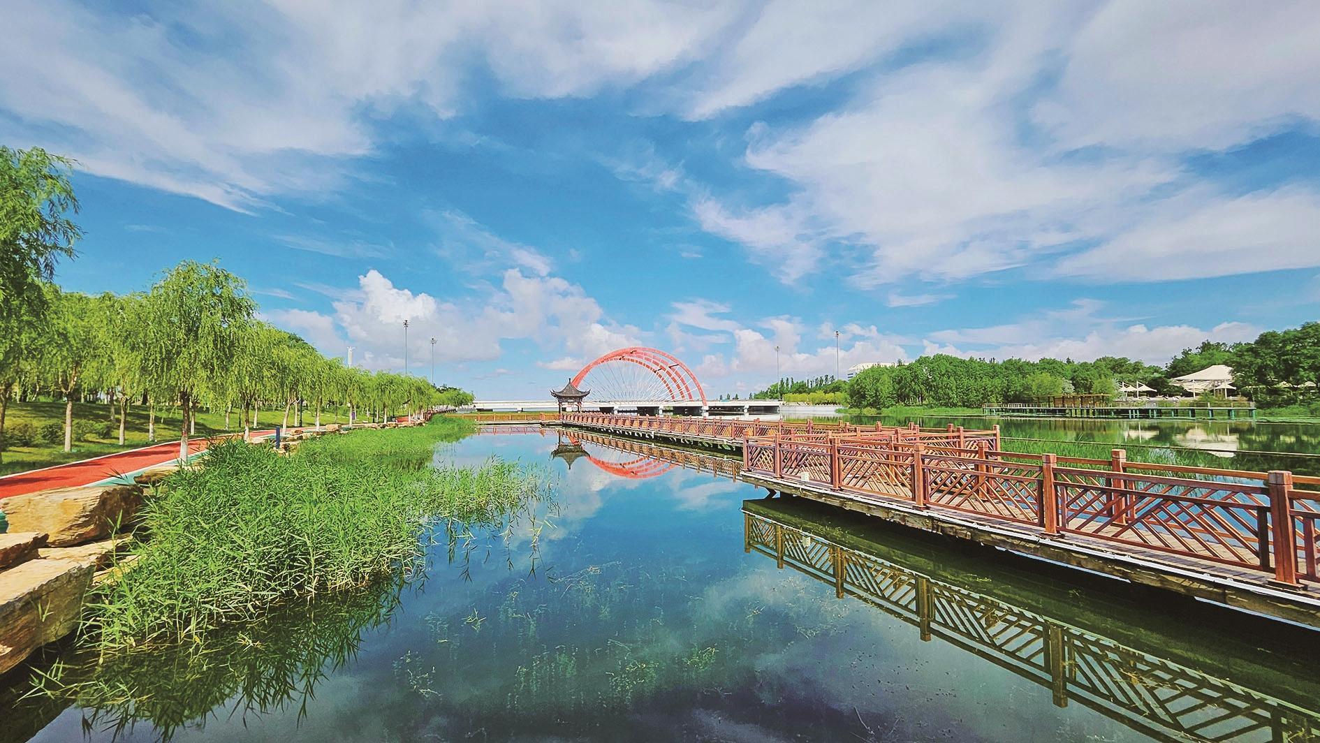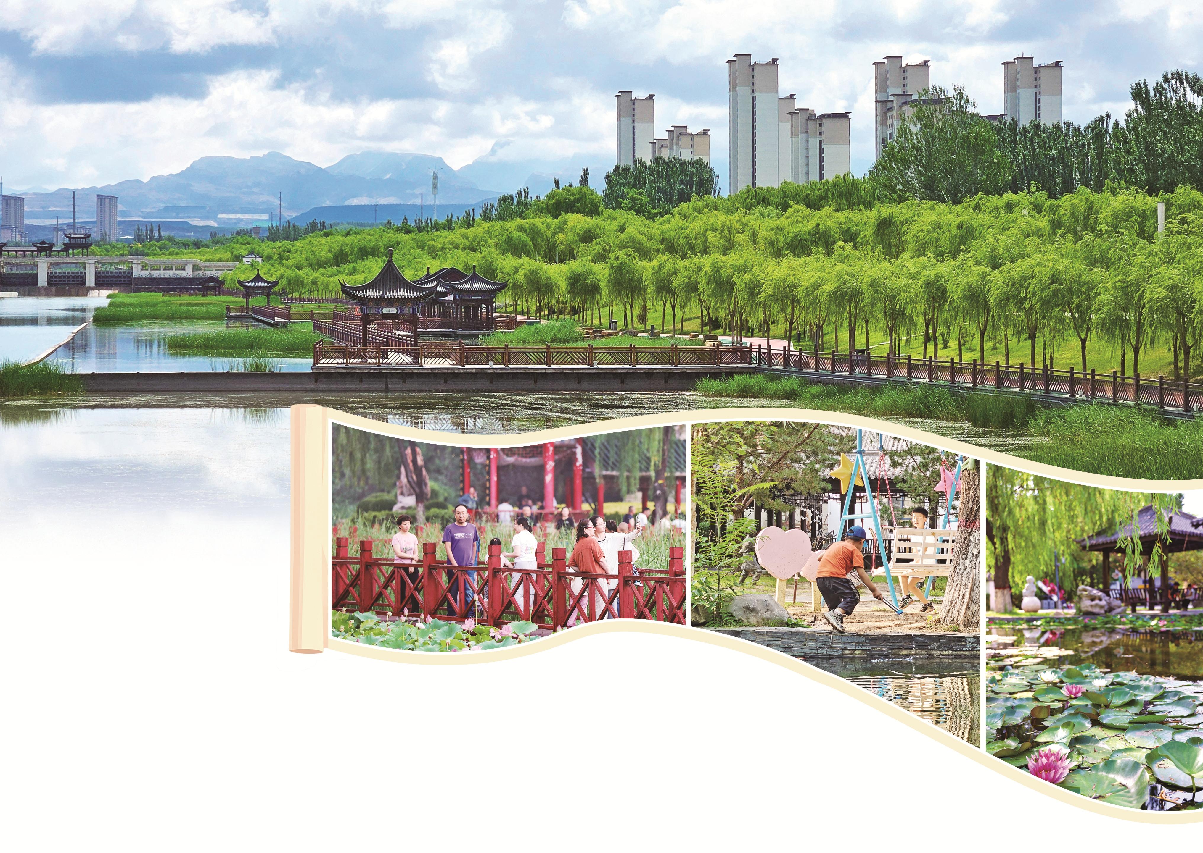 自然与城市交融的生态画卷。(韩刘洋 摄) 赏荷正当时。(高瑞鹏 摄) 市民赏花游玩,乐享美景。(高瑞鹏 摄) 绿境童欢。(赵政宇 摄)