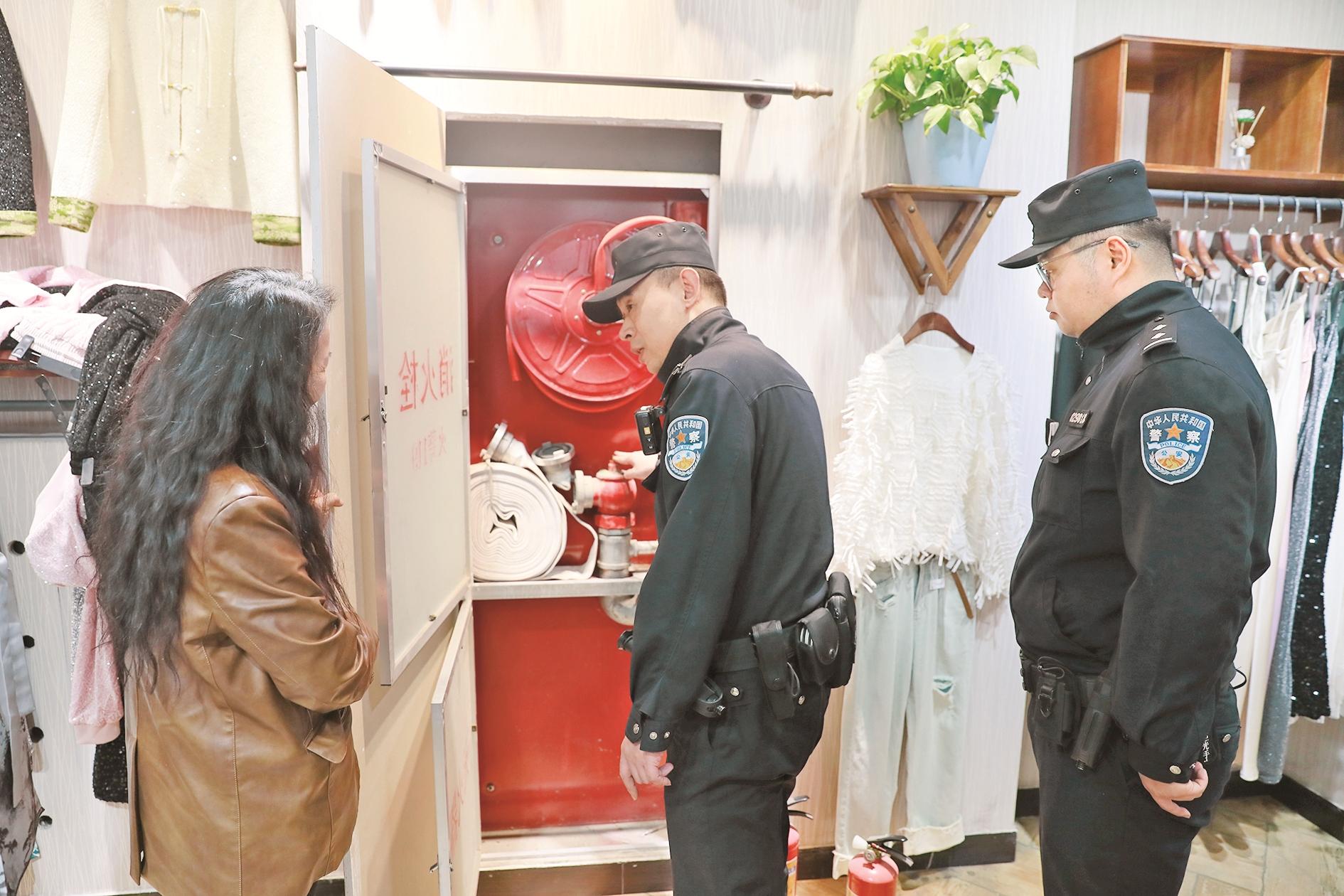 8月1日、2日晚,我市公安机关组织开展2025年第五次夏季治安清查集中统一行动。民警、辅警全面开展重点场所清查、治安隐患排查、打击违法犯罪、街面巡逻防控等工作,有效提升辖区社会治安综合治理水平。图为民警检查商铺消防设施情况。 (曹艺 摄)