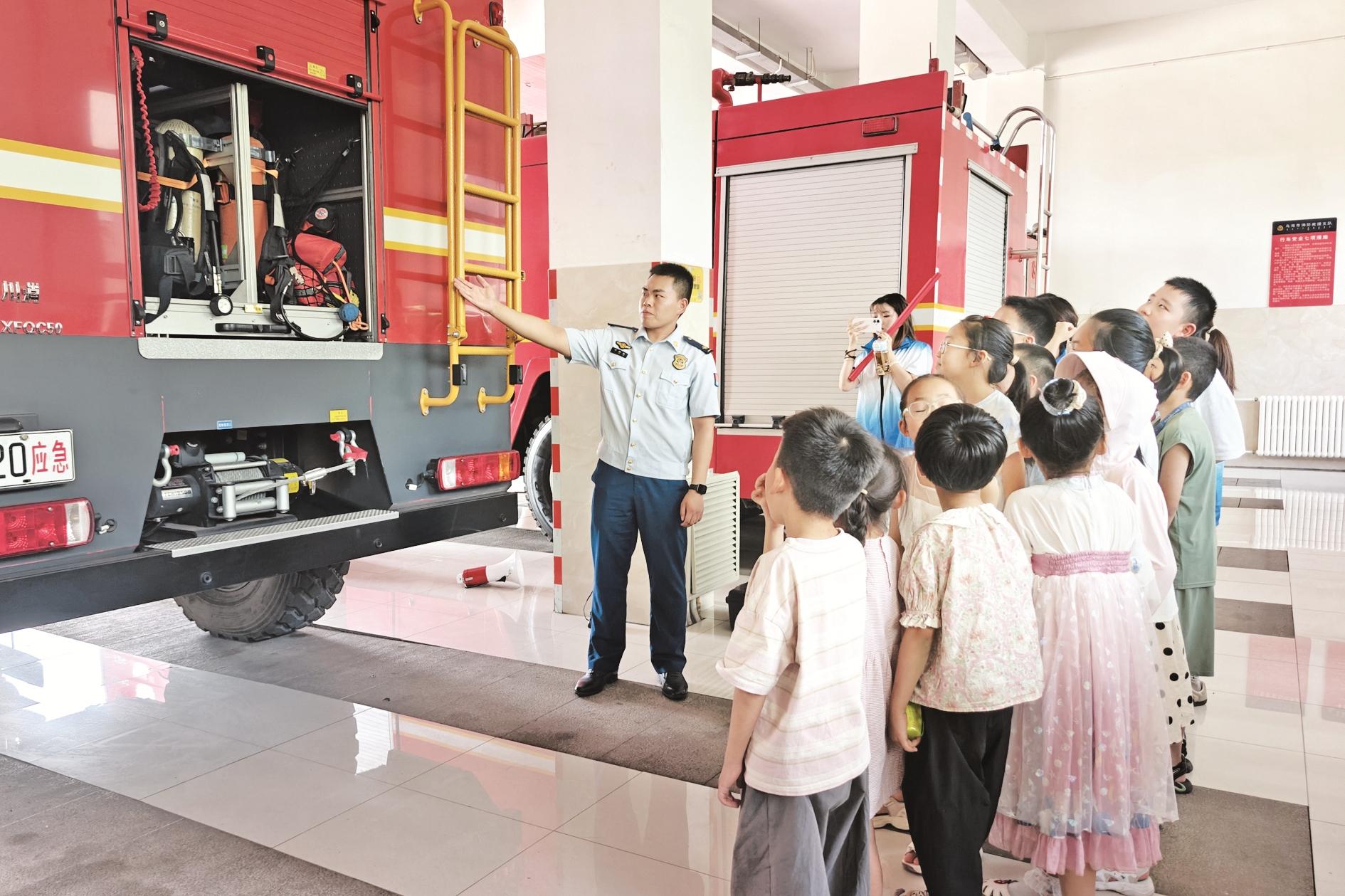 为进一步增强辖区少年儿童消防安全意识,提升自救能力,近日,乌达区消防救援大队联合梁家沟街道永昌佳苑社区开展了“走进消防营 安全伴成长”活动。消防队员带领小朋友们参观了器材库、执勤车辆、个人防护装备等,并讲解了初期火灾扑救、火场逃生自救、灭火器使用方法等知识。 (黄建飞 摄)