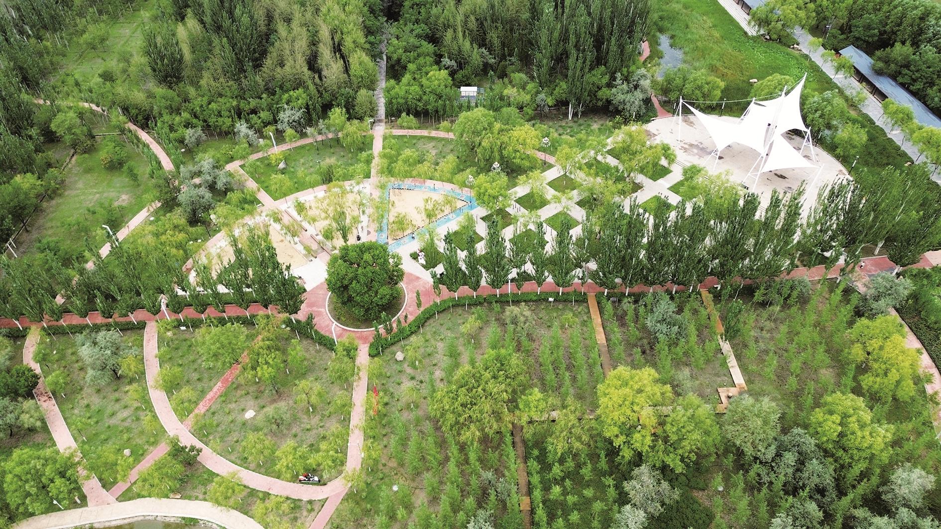 俯瞰乌海植物园,各式绿植错落交织,步道蜿蜒穿梭,不同区域巧妙划分,为城市增添绿意,也为市民放松休闲提供了好去处。 (赵政宇 摄)