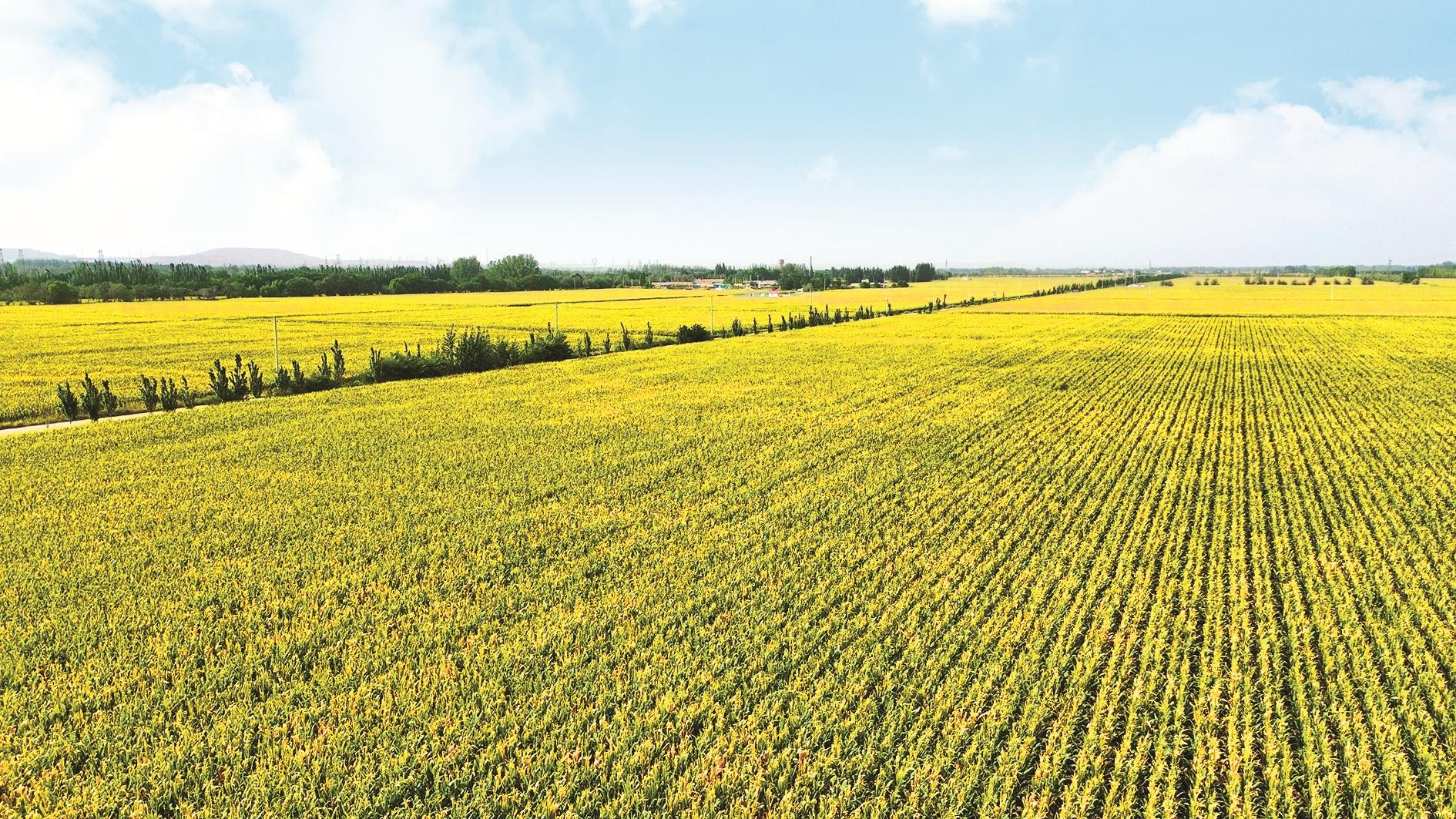 金秋时节,希望的田野上处处洋溢着丰收的喜悦。在乌达区乌兰淖尔镇,一望无际的玉米田如金色的海浪在大地上铺展延伸。 (赵政宇 摄)