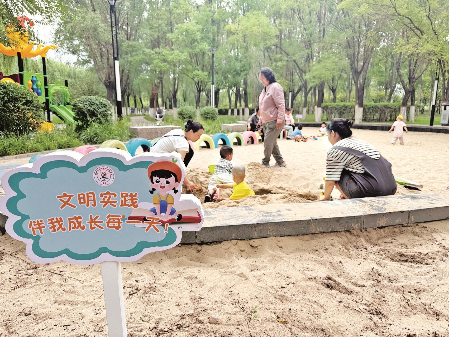 傍晚时分,夕阳余晖洒在海勃湾区凤凰岭街道长青社区工行南小区北侧的口袋公园,迷你沙滩旁的亲子互动、滑梯上的欢声笑语、秋千里的飞扬童趣,构成了一幅温馨和谐的儿童友好城市图景。