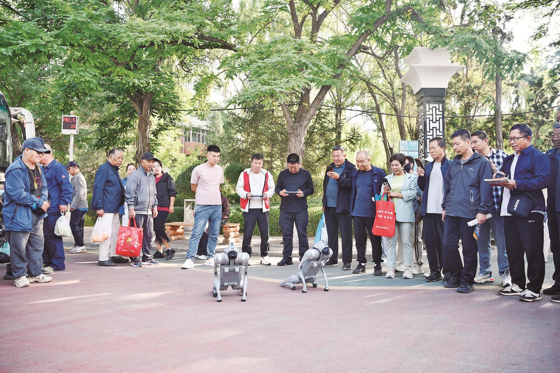 “这个机器狗太逗了,还会握手、作揖卖萌!”两只机器狗一亮相,迅速成为全场焦点,众多市民秒被“圈粉”,纷纷举起手机记录这灵动瞬间。无人机表演区惊叹声不断,无人机穿梭腾挪、精准穿越障碍,引得不少观众举起手机一路跟拍,生怕错过任何一个精彩镜头。