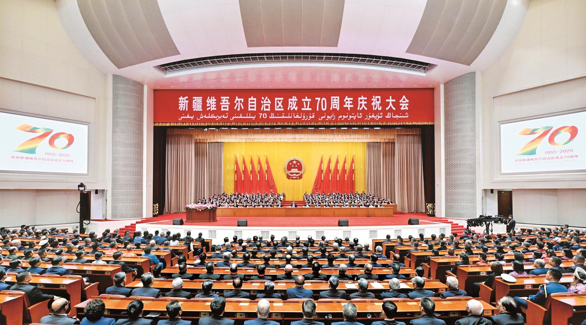 王沪宁发表讲话。他说,70年前,在党中央亲切关怀和党的民族政策光辉照耀下,新疆维吾尔自治区宣告成立。70年来特别是新时代以来,在党的领导下,新疆各族人民共同当家作主,不断夺取社会主义革命、建设和改革开放的伟大胜利。以习近平同志为核心的党中央坚持从战略上审视和谋划新疆工作,确立新时代党的治疆方略,推动新疆各项事业取得历史性成就,新疆同全国一道打赢脱贫攻坚战、全面建成小康社会,新疆各民族大团结不断巩固深化、中华民族共同体意识深入人心,各族人民像石榴籽一样紧紧抱在一起、昂首阔步走在中国式现代化道路上。