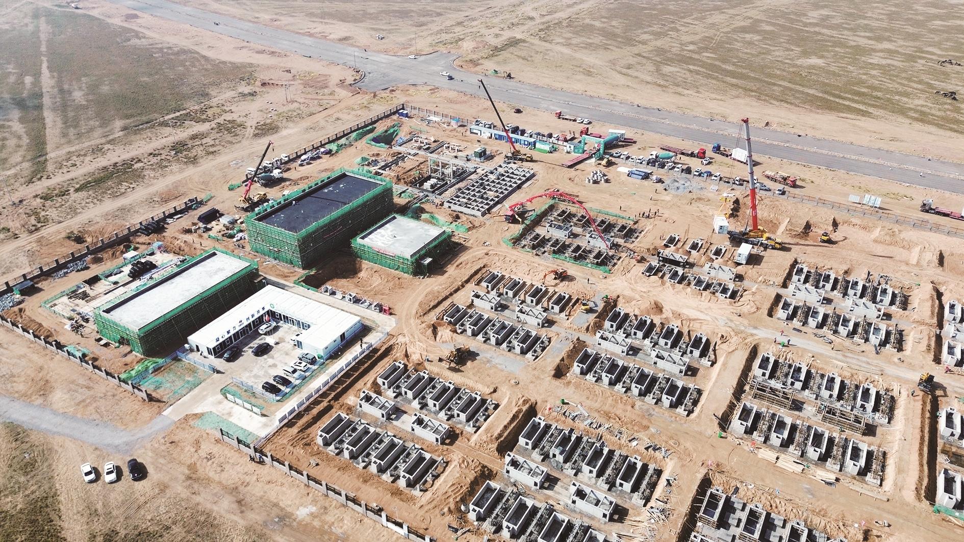 中国绿发投资集团有限公司乌海市20万千瓦/80万千瓦时固态电池储能电站项目航拍一景。 (赵政宇 摄)