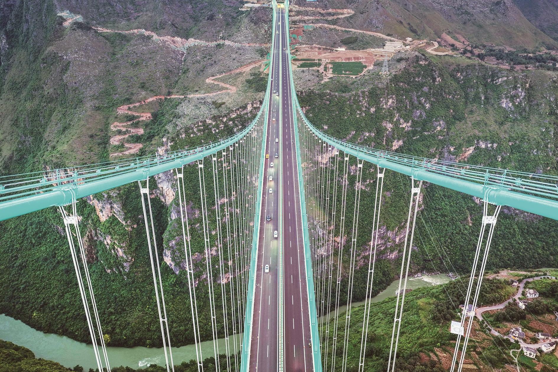 9月28日,车辆行驶在已正式通车的贵州花江峡谷大桥上(无人机照片)。9月28日,世界第一高桥——贵州花江峡谷大桥建成通车。花江峡谷大桥是贵州六枝至安龙高速公路的控制性工程,大桥全长2890米,主跨径1420米,是目前世界山区峡谷第一大跨度钢桁梁悬索桥;其桥面距水面垂直高度625米,是新的世界第一高桥。