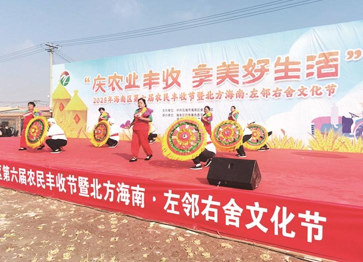 春华染田畴,秋实满乡村。秋分时节,2025年海南区第六届农民丰收节暨“北方海南·左邻右舍”文化节在拉僧庙镇赛汗乌素村黄河西行客栈广场启幕。农区居民携着丰收的果实欢聚一堂,载歌载舞话丰年,让丰收的喜悦在广场上尽情流淌。