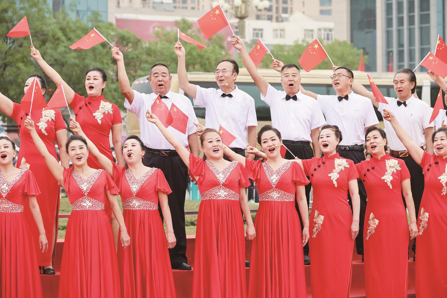 随后,自治区级非遗代表性项目——蒙古族马头琴音乐《我和我的祖国》奏响,悠扬的琴声如草原清风拂面,将对祖国的眷恋融入每一个音符,引发全场共鸣。马头琴的婉转余韵尚未散尽,合唱《我爱你中国》的旋律又响彻广场,国家能源集团乌海能源公司音乐舞蹈协会的队员们身着红色礼服,排着整齐的队列走上舞台,歌声响起,现场气氛逐渐走向高潮。队员顾艳君唱得格外投入,声音里满是激动之情,“能以这样的方式为祖国庆生,既是荣誉,更是责任,也让我对‘爱国’二字有了更具象、更真切的理解。”