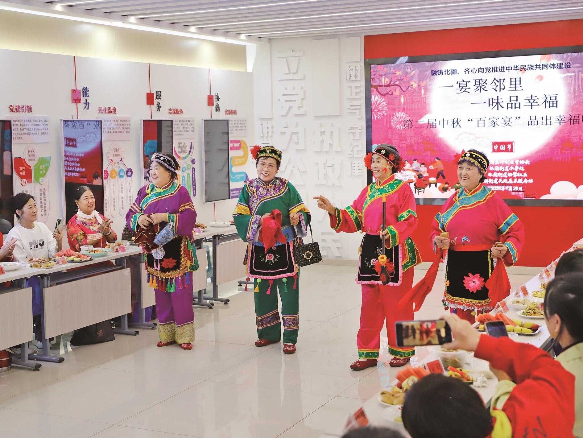国庆中秋假期,当“国的庆典”与“家的团圆”在丰收时节相遇,人们用各种方式表达着对祖国的热爱和祝福。一系列丰富多彩的文艺演出和文化活动在我市各社区蓬勃开展,居民在文化体验、邻里互动中沉浸式感受节日魅力,共绘幸福和谐画卷。图为近日,海勃湾区林荫街道海馨社区的“百家宴”活动中居民献艺贺中秋。
