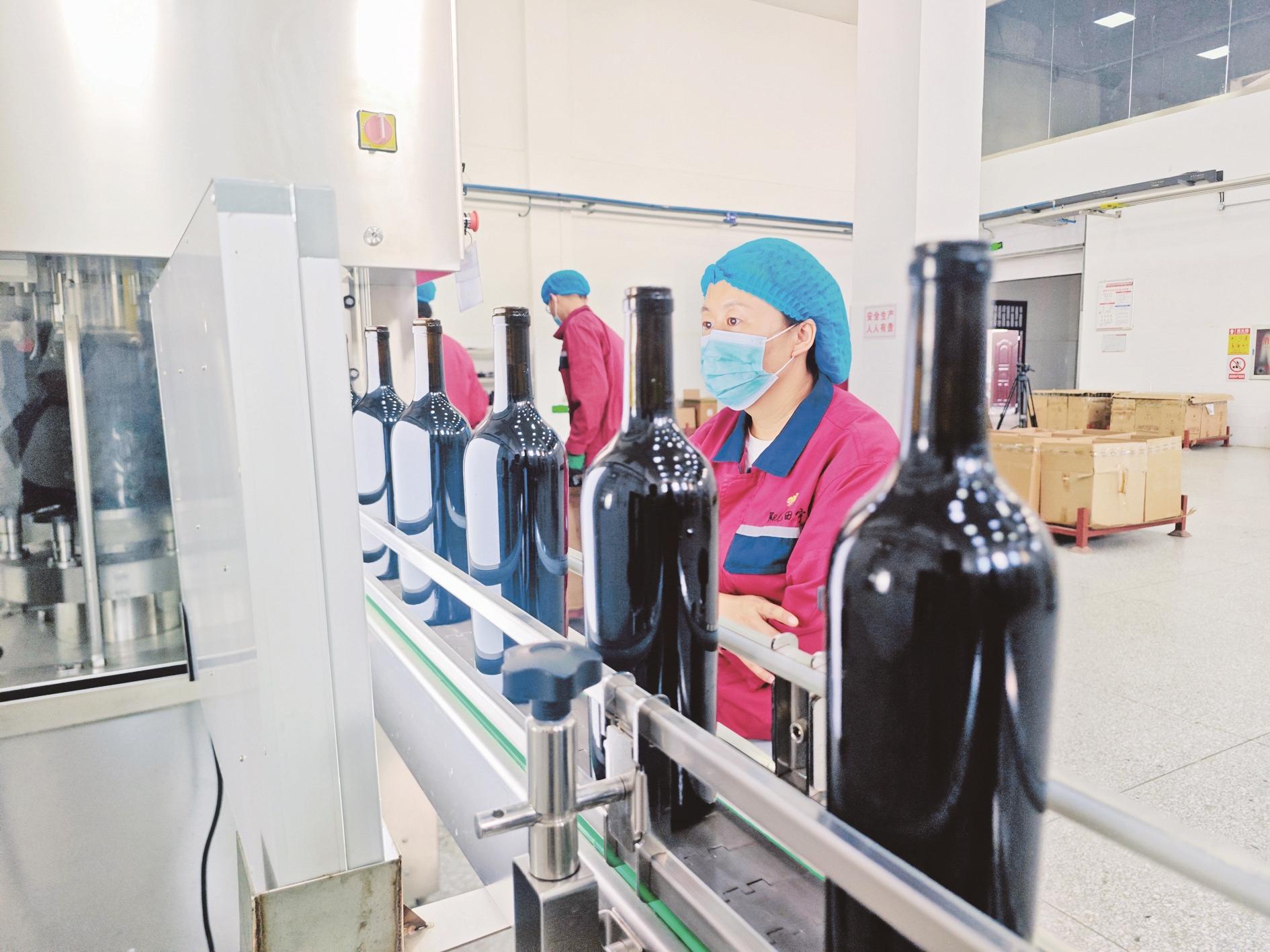 连日来,我市各大葡萄酒生产企业纷纷按下节后生产的“加速键”,开足马力忙生产、赶订单、拓销路,生产线上呈现出一片红红火火的景象。图为阳光田宇国际酒庄生产车间,工人有条不紊地检查瓶装葡萄酒的生产日期、商标等,检查合格后,打包装箱,销往全国各地。