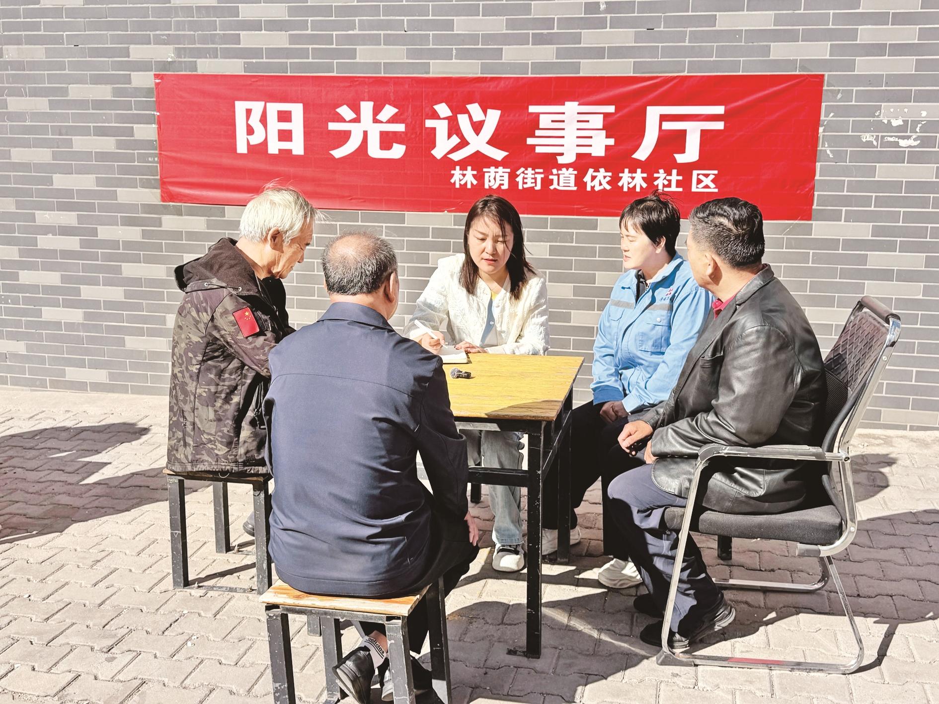 依林社区成立于2013年,辖区内的依林佳苑A区、B区均为棚改安置小区,42栋楼里住着3916户居民,他们大多是乌达区、海南区煤矿棚户区和海勃湾区征地拆迁安置群体。由于居民构成复杂,物业服务等问题曾频繁引发矛盾,如何做好服务、促进融合,成为社区党委面临的首要课题。“我们深知,社区治理不能靠‘单打独斗’,必须发动大家一起参与。”依林社区党委书记王玉说,面对民意收集难、议事协商难、民主自治难等问题,社区以党建为引领,以网格化管理为抓手,传承新时代“枫桥经验”,探索出“多元共建”服务管理模式,而“阳光议事厅”就是其中最亮眼的实践。