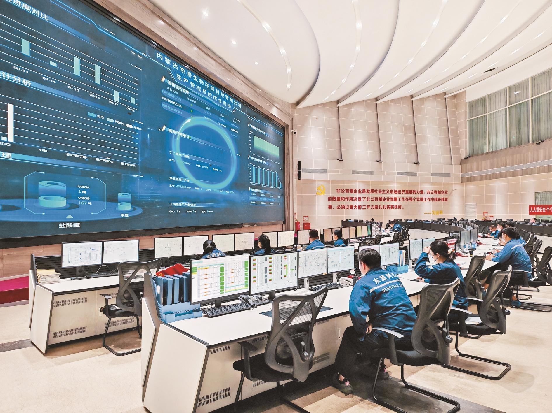 作为乌达区智能制造的另一标杆,内蒙古东景生物环保科技有限公司申报的“y-丁内酯(GBL)全流程数智协同智能工厂”项目升级后,关键设备数字化、智能化率由建设前的80%提高到了100%,人工智能应用场景由原来的20个增加到60个,生产效率与设备利用率得到显著提升。在能源与资源管控方面,智能工厂的优势进一步凸显。通过精细化管理,该公司资源综合利用率从85%提高至95%,有效降低能耗成本;在环保合规与数据溯源领域,实时监测废水、废气排放数据,自动对比国家标准,超标时触发预警并记录整改过程,一般固废综合利用率由原来的95%提升到98%,单位产值二氧化碳排放量由37.62%降至37.21%,并通过关联生产数据精准识别高污染环节,助力企业实现绿色低碳生产。