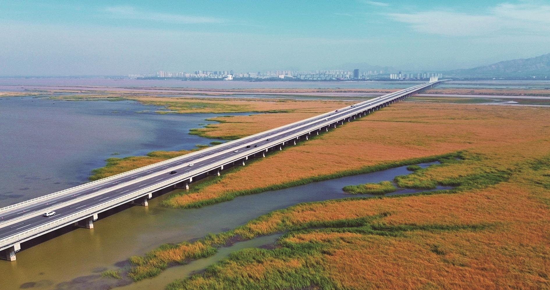 航拍镜头下,乌海湖大桥架于黄河岸畔的湿地之上;湿地中,金黄的芦苇与远处蓝天交相映衬,共同勾勒出一幅壮阔的湿地秋景图。