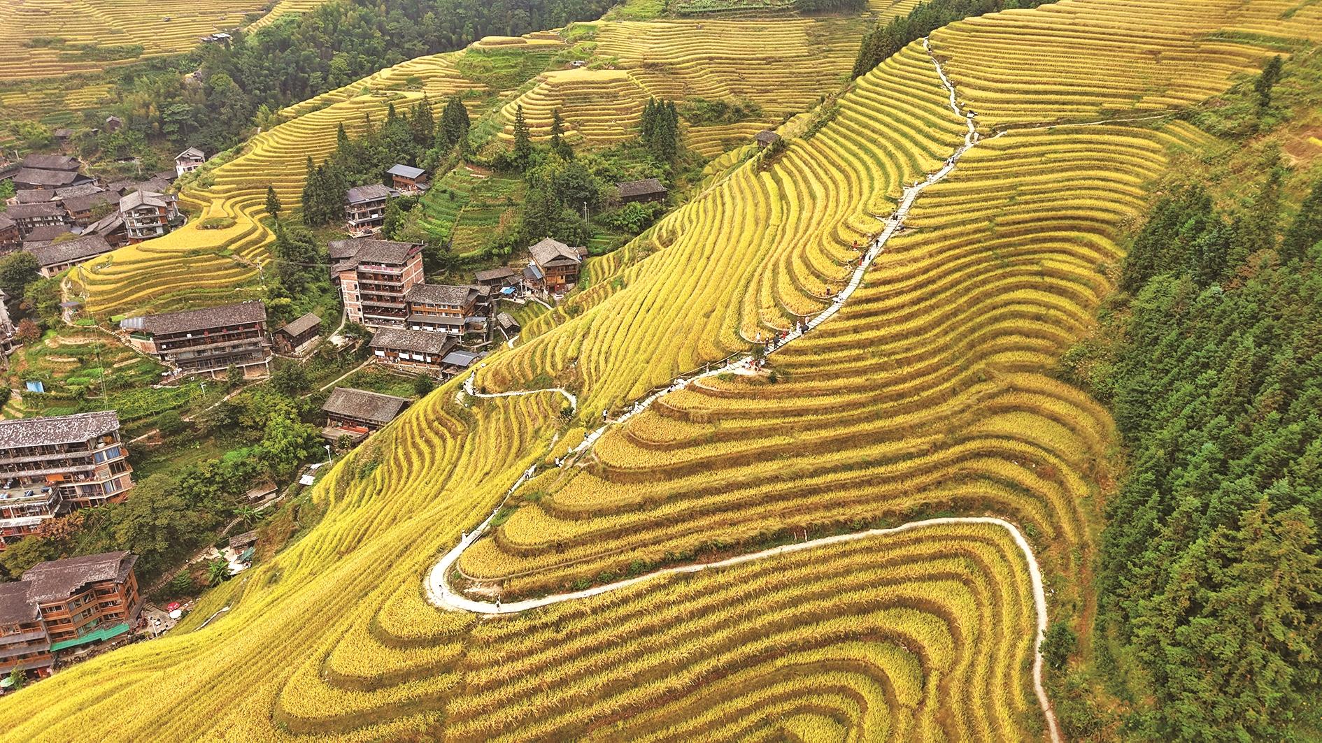 10月12日,游客在广西桂林市龙胜各族自治县龙脊梯田景区观光游览。金秋十月,各地美景如画。