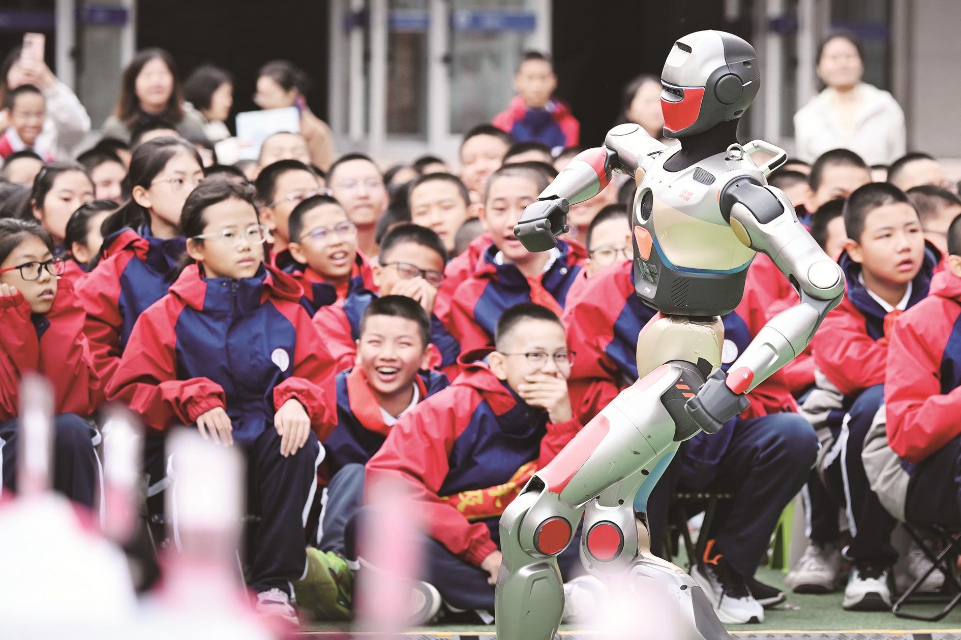 10月13日,新疆生产建设兵团第一中学学生在科技节开幕式上观看智能机器人跳舞。近日,新疆生产建设兵团第一中学举办以“风华兵一卓行未来 AI启航智越江海”为主题的科技节活动,通过体验科学实验、开展科技创新制作等活动,培养学生的创新精神,以及对人工智能技术的认识和运用能力。