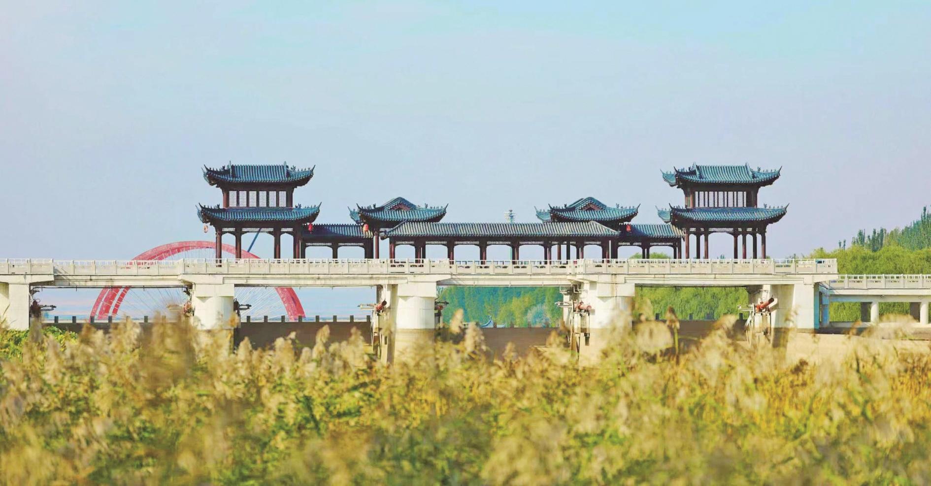 秋风吹过甘德尔河,河道内金黄的芦苇轻柔起舞,与桥上的亭阁、远处的树木、彩虹桥,在蓝天下相互映衬,形成层次分明的画卷,营造出静谧而梦幻的氛围。图为海勃湾区甘德尔河一景。