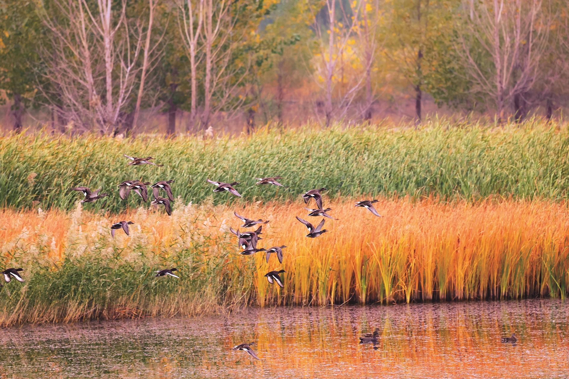 沿着黄河岸边的公路前行,不远处便是龙游湾国家湿地公园。这里的秋景更是别有一番风味。树木褪去了翠绿,换上了耀眼的金黄,广袤的田野里,一捆捆草垛错落有致地散布在草地上,诉说着丰收的喜悦。远处的芦苇荡与天际线相连,芦苇花在风中轻舞,时而聚拢、时而散开,与水面上掠过的水鸟构成灵动的剪影。林间的候鸟也多了起来,一群群白鹭在水面上盘旋,偶尔俯冲下去,叼起一条小鱼,然后又展翅飞向远方,给这片宁静的湿地增添了几分生机与活力。
