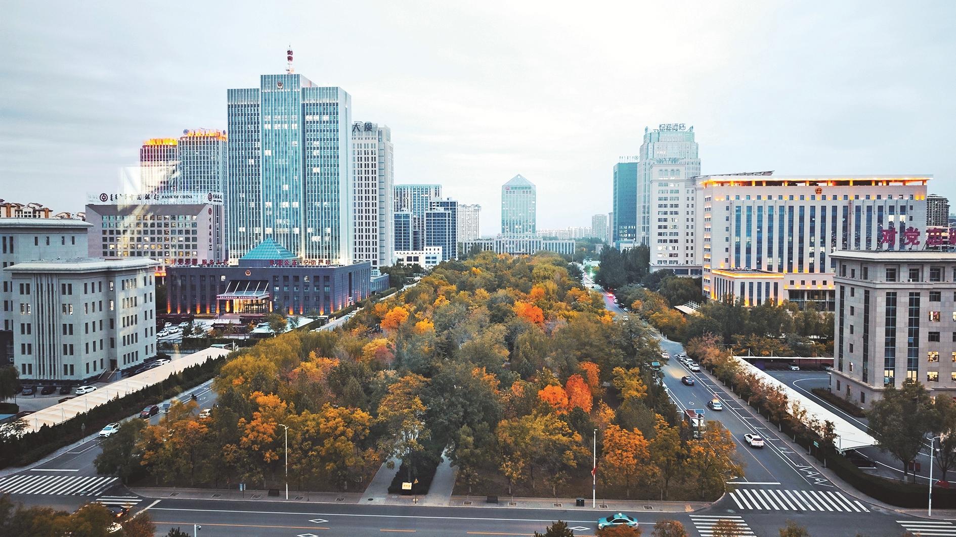 傍晚时分,夕阳西下,天边被染上了一层温暖的橘红色。黄河水面波光粼粼,像铺满了碎金;甘德尔山的轮廓在夕阳的映照下显得格外清晰;城市里的灯光渐渐亮起,与天边的晚霞交相辉映,构成了一幅温馨而浪漫的秋日晚景图。