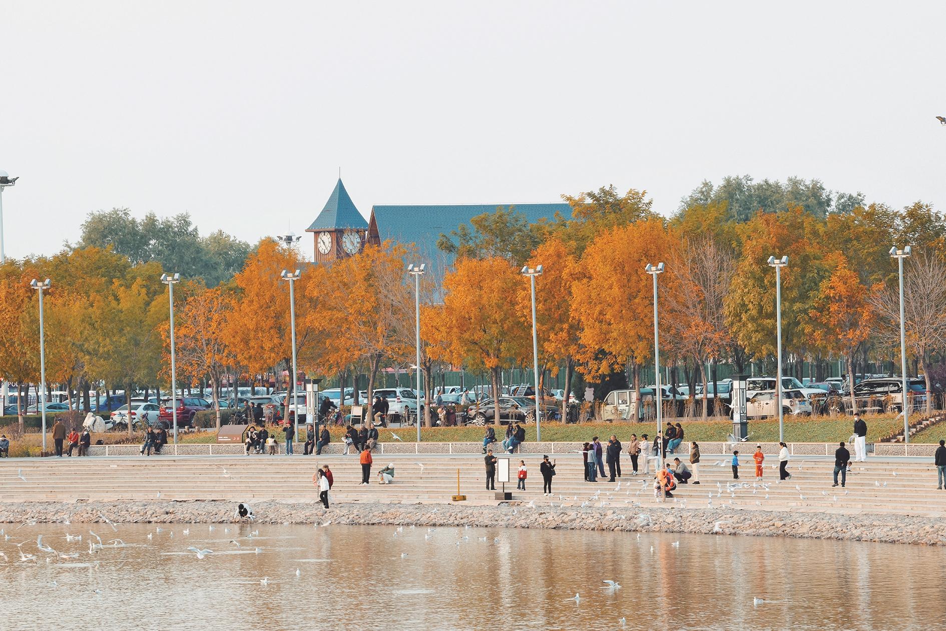 秋日的乌海湖畔,树木黄、橙、绿多色层叠,秋色美不胜收。堤岸石阶上,市民驻足,或观湖面鸥鸟,或赏远方湖景,尽情享受独属秋日的惬意时光。图为近日的乌海湖一号码头一景。