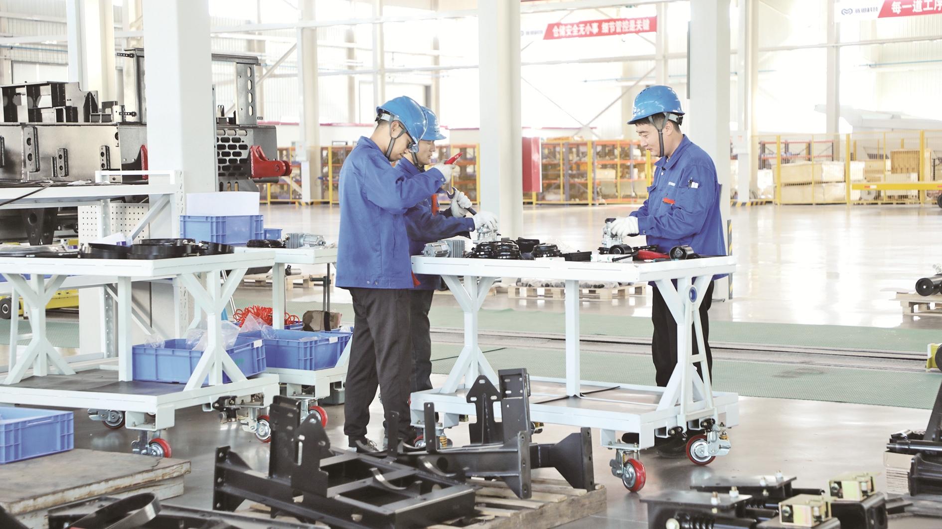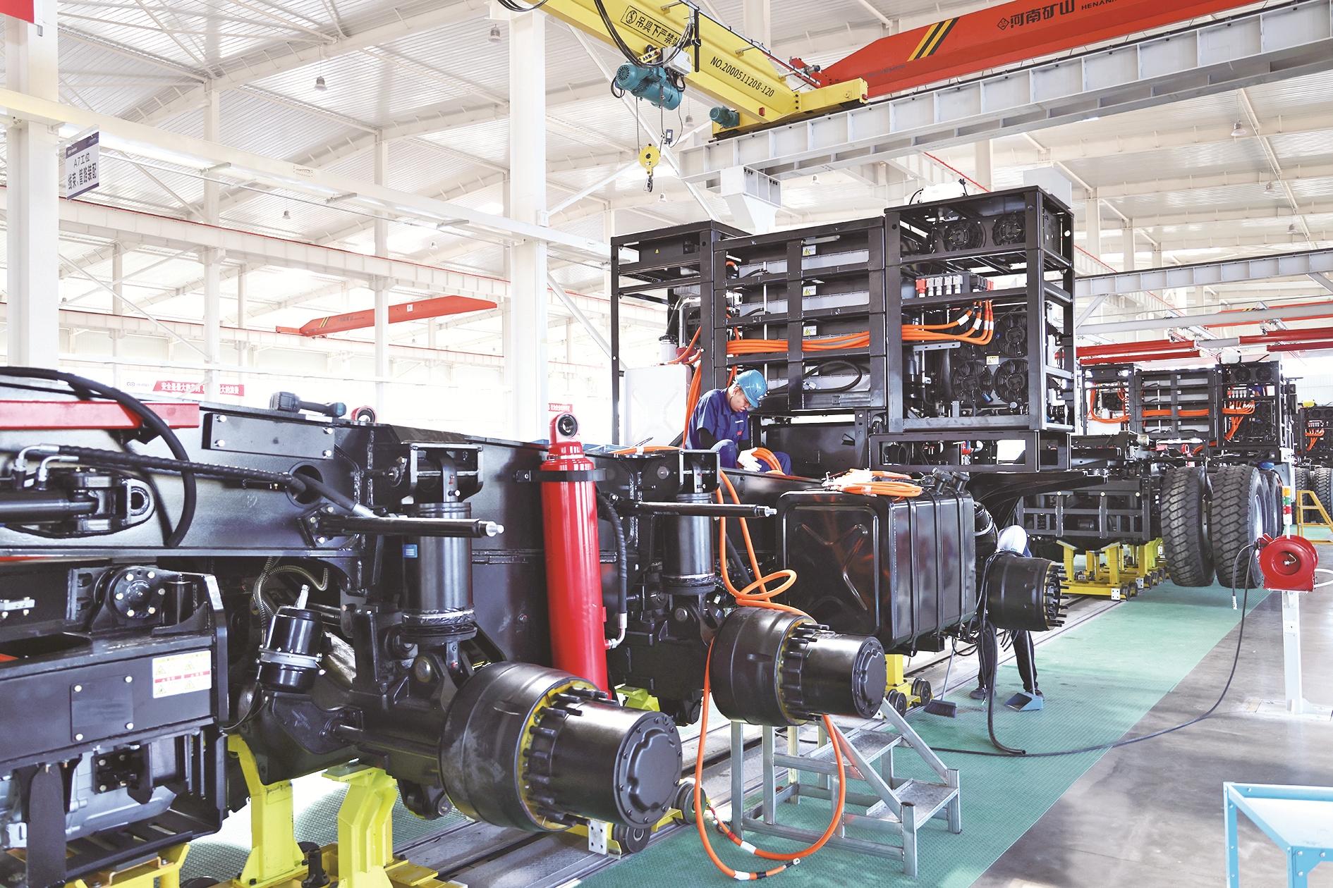 乌海铱钼新能源科技有限公司生产车间内,工人们正在组装新能源矿卡。(高瑞鹏 摄)