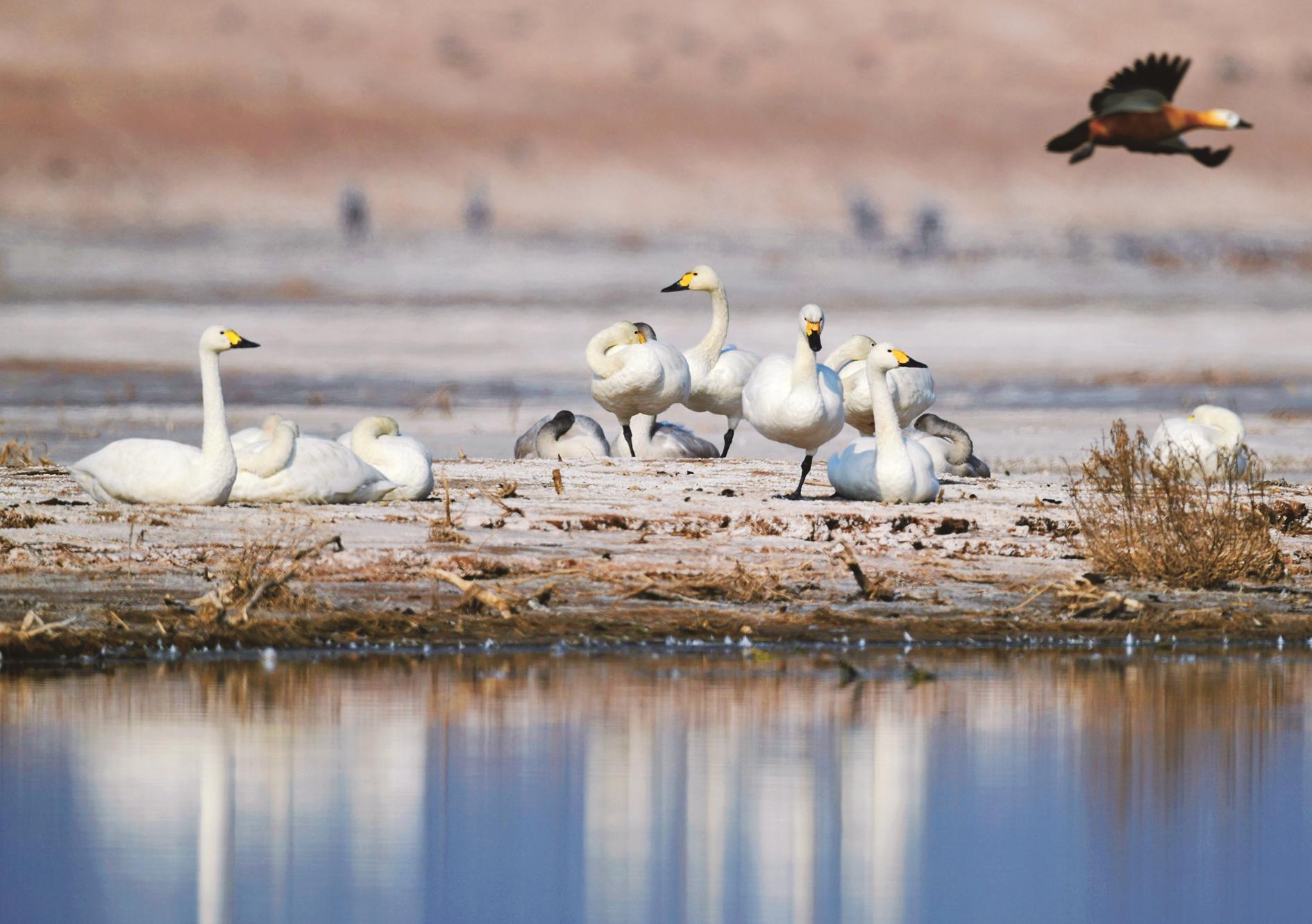 黄河乌海段滩涂上,白天鹅、鸿雁、赤麻鸭、白鹭、红嘴鸥等翩跹起舞、悠然游弋,它们将在这里补给休息,再踏上旅程;龙游湾国家湿地公园,金黄的秋草在风中摇曳,草色尽头,水天一色的画面似诗如画;在秋高气爽、风日晴和的早晨,有孩童捡拾落叶,收集大自然赠予的美好……高空俯瞰,山、水、沙、城与人、与候鸟在此刻失去界限,和谐共生。