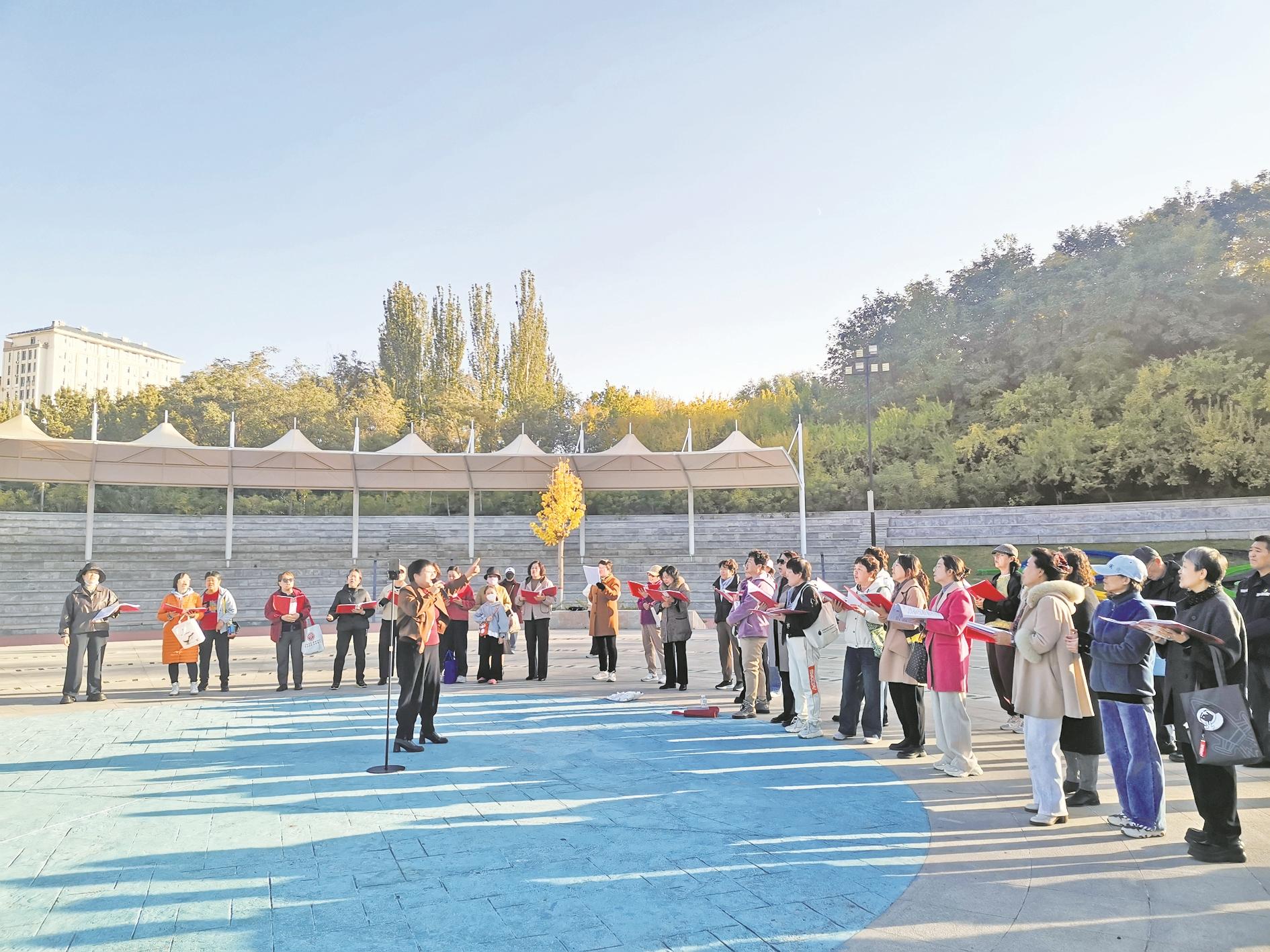 “秋天的公园特别美,这几天的天气也很好,天空蓝蓝的,阳光照在身上很暖,我们就站在这里听歌、学歌,跟着骆老师的示范,与大家伙儿一起唱,用歌声遇见这美好的秋色。”潘丽疆告诉记者,每当悠扬的旋律响起来,这里就变成了一个设在大自然中的合唱舞台,山上愈发斑斓的秋色就是舞台背景,当自带“混响”的歌声响起时,便会吸引公园赏秋的人们驻足聆听。