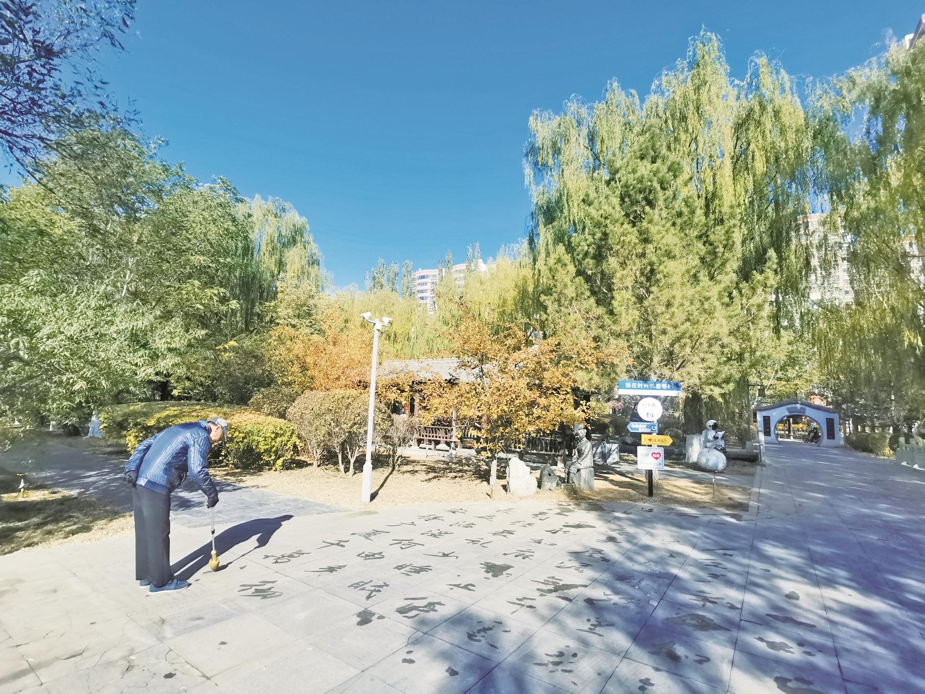 上午的市人民公园比起早晨要安静得多,尤其在秋色更加浓郁的社会主义核心价值观主题园内,只能听到秋风吹过树叶的簌簌声与鸟儿清脆的鸣叫声。这正是地书爱好者们最喜欢的时段,他们可以沉浸其中,用手中的笔尽情地书写,那些印在地上的字或娟秀或磅礴,虽然存留时间并不长,但却与周围的秋景相得益彰。