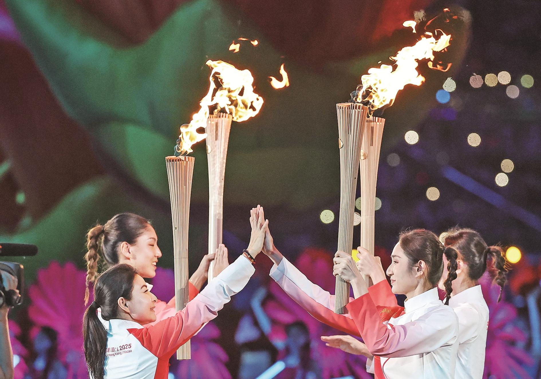 11月9日,火炬手郭晶晶(前左)、王欣瑜(后左)、王柳懿/王芊懿在开幕式上进行火炬交接。新华社记者 潘昱龙 摄