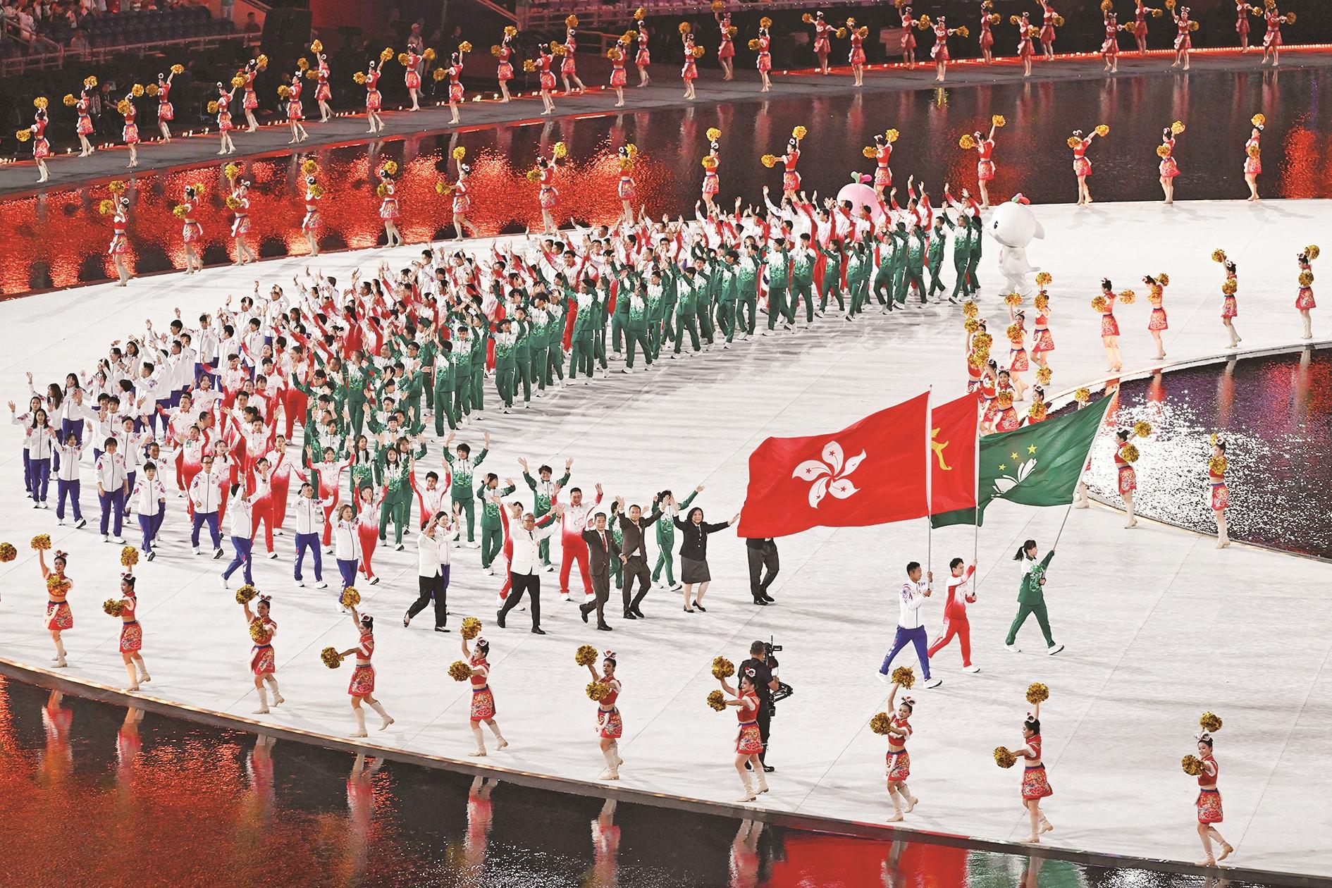 11月9日,广东省体育代表团、香港特别行政区体育代表团、澳门特别行政区体育代表团在入场仪式上共同入场。新华社记者 胡虎虎 摄