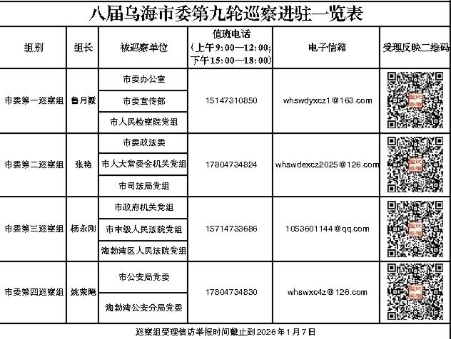 据悉,市委巡察组现场巡察时间为70天左右,受理信访时间截止到2026年1月7日。巡察期间将设立值班电话、电子邮箱等,主要受理反映被巡察党组织领导班子及其成员、下一级党组织主要负责人、所属单位(内设机构)主要负责人,以及重要岗位领导干部问题的来信来电来访,重点是关于违反政治纪律、组织纪律、廉洁纪律、群众纪律、工作纪律、生活纪律等方面的举报和反映。其他不属于巡察受理范围的信访问题,将按规定交有关方面认真处理。