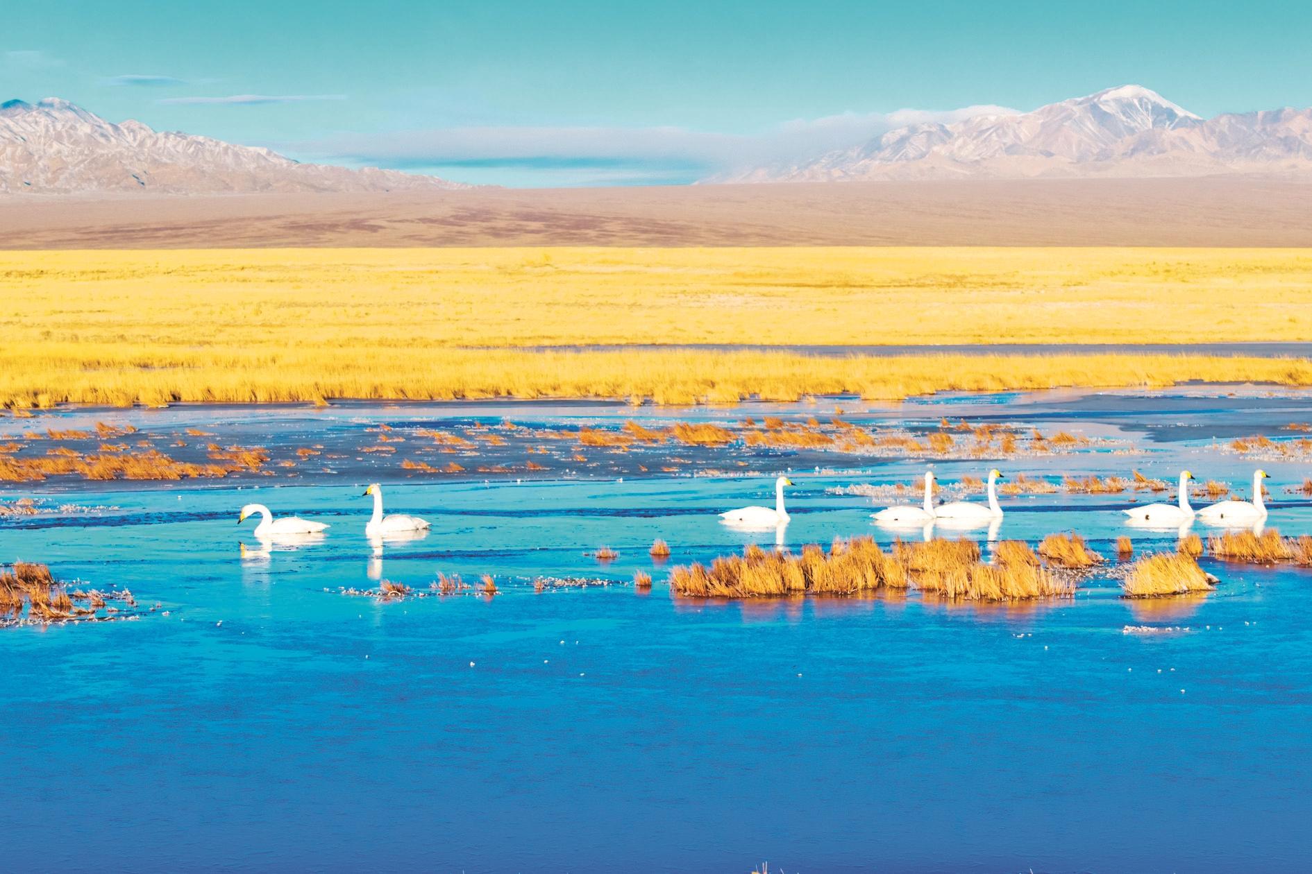 11月14日,在河西走廊西端的甘肃省阿克塞县小苏干湖湿地,大天鹅在一处水域游弋觅食(无人机照片)。初冬时节,作为候鸟迁徙的中亚通道和东亚—澳大利亚通道两条线路的重要中转站,河西走廊吸引了大量候鸟在此停歇休憩、越冬栖息。河西走廊地处甘肃省西北部,东西长约1000公里,南北最宽处近200公里,最狭窄处仅数公里。得益于祁连山冰雪融水的滋养,这条狭长走廊中形成了片片绿洲。区域内河流、湖泊、湿地与人工库塘星罗棋布,为候鸟提供了良好的栖息环境和丰富的食物资源,使这里成为我国西北候鸟迁徙路线上不可或缺的“生态驿站”。 新华社记者 郎兵兵 摄