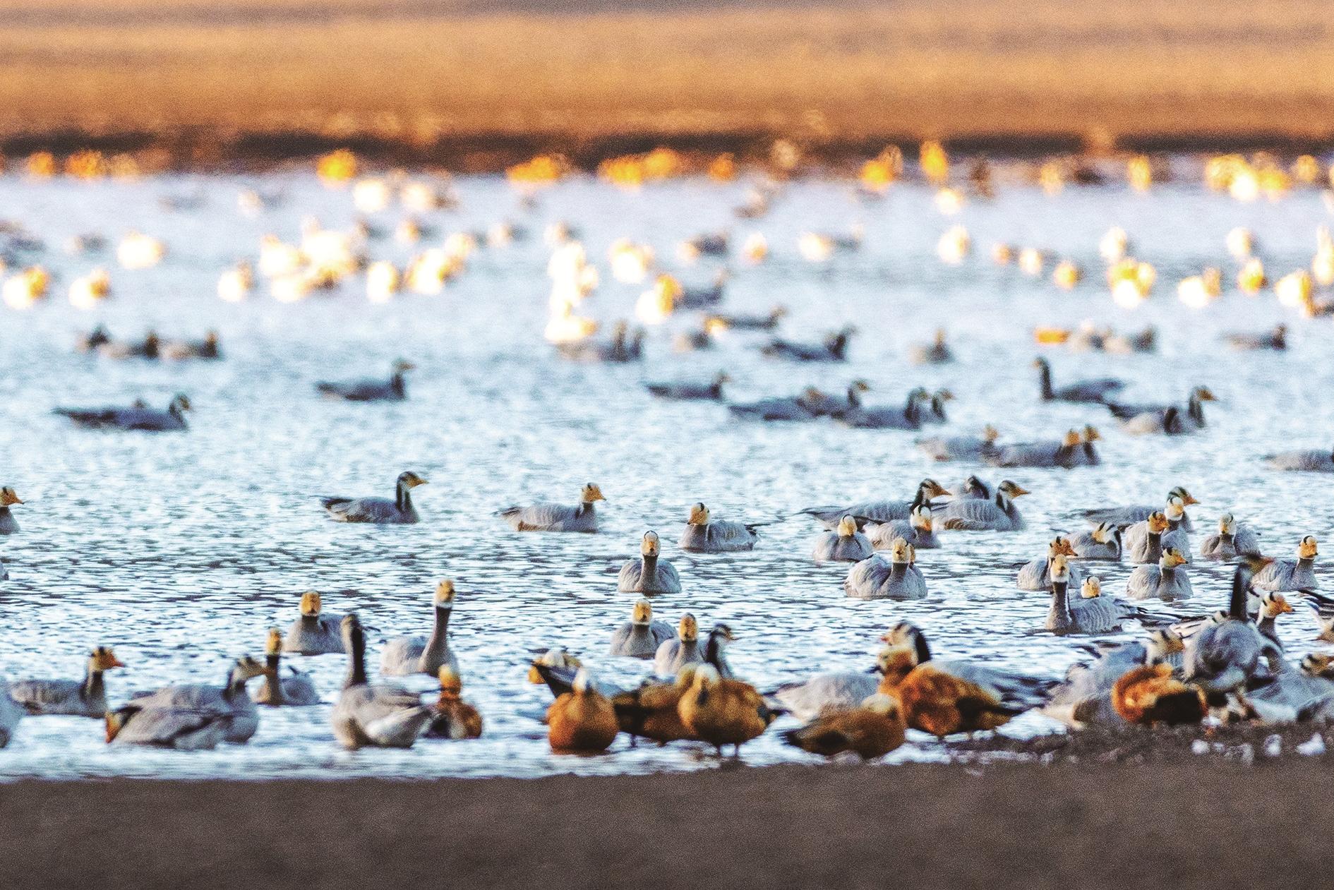 这是11月23日在西藏拉萨市林周县拍摄的越冬候鸟。冬日时节,拉萨市林周县迎来大批越冬候鸟,黑颈鹤、斑头雁、赤麻鸭等候鸟在河谷、湖泊等地觅食、休憩。 新华社记者 李键 摄