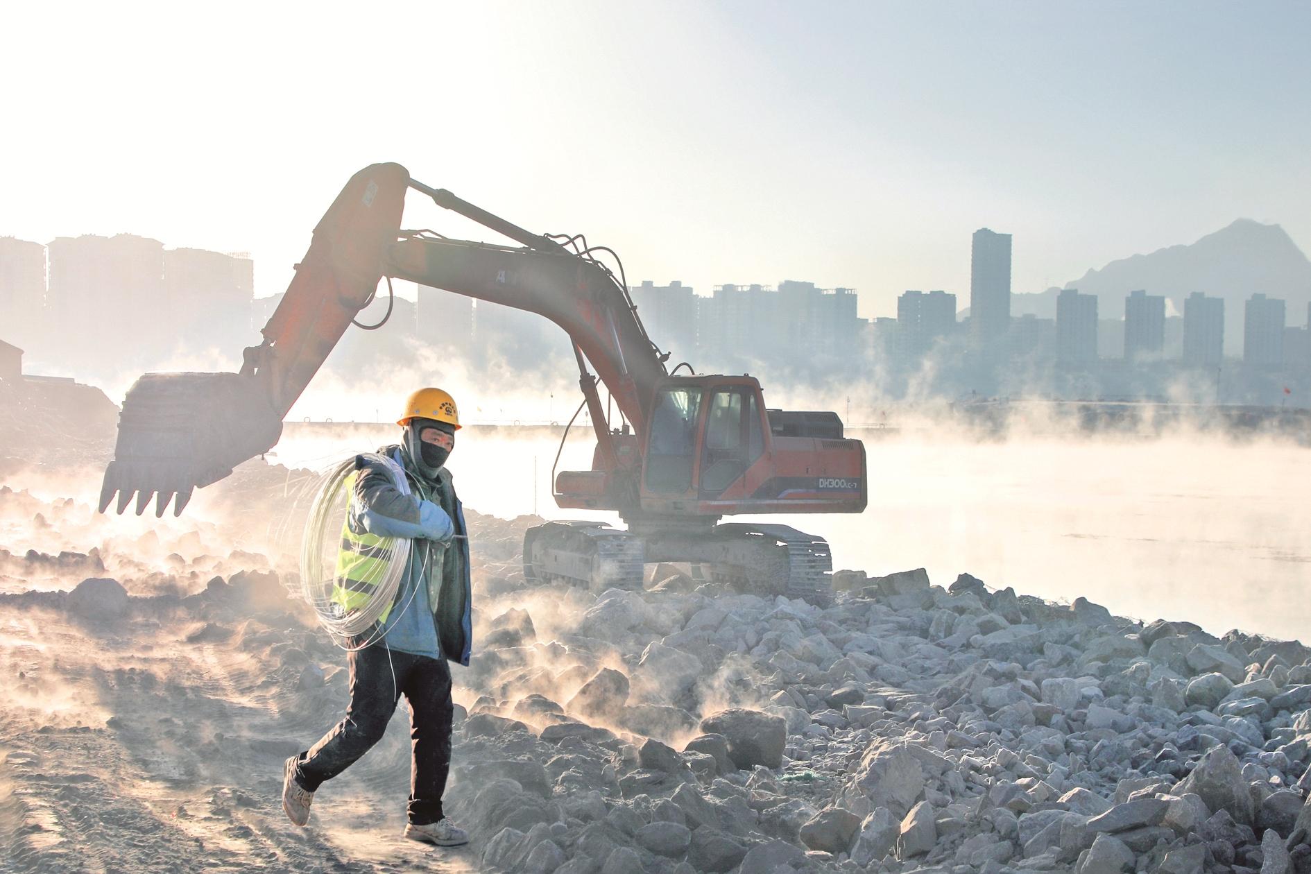 工地上,一片繁忙景象,柔臂捆钢骨,天寒筑堤坝,这些瞬间都是发展的轨迹,是繁华的缩影,是城市特有的风景线。 (靳婧)