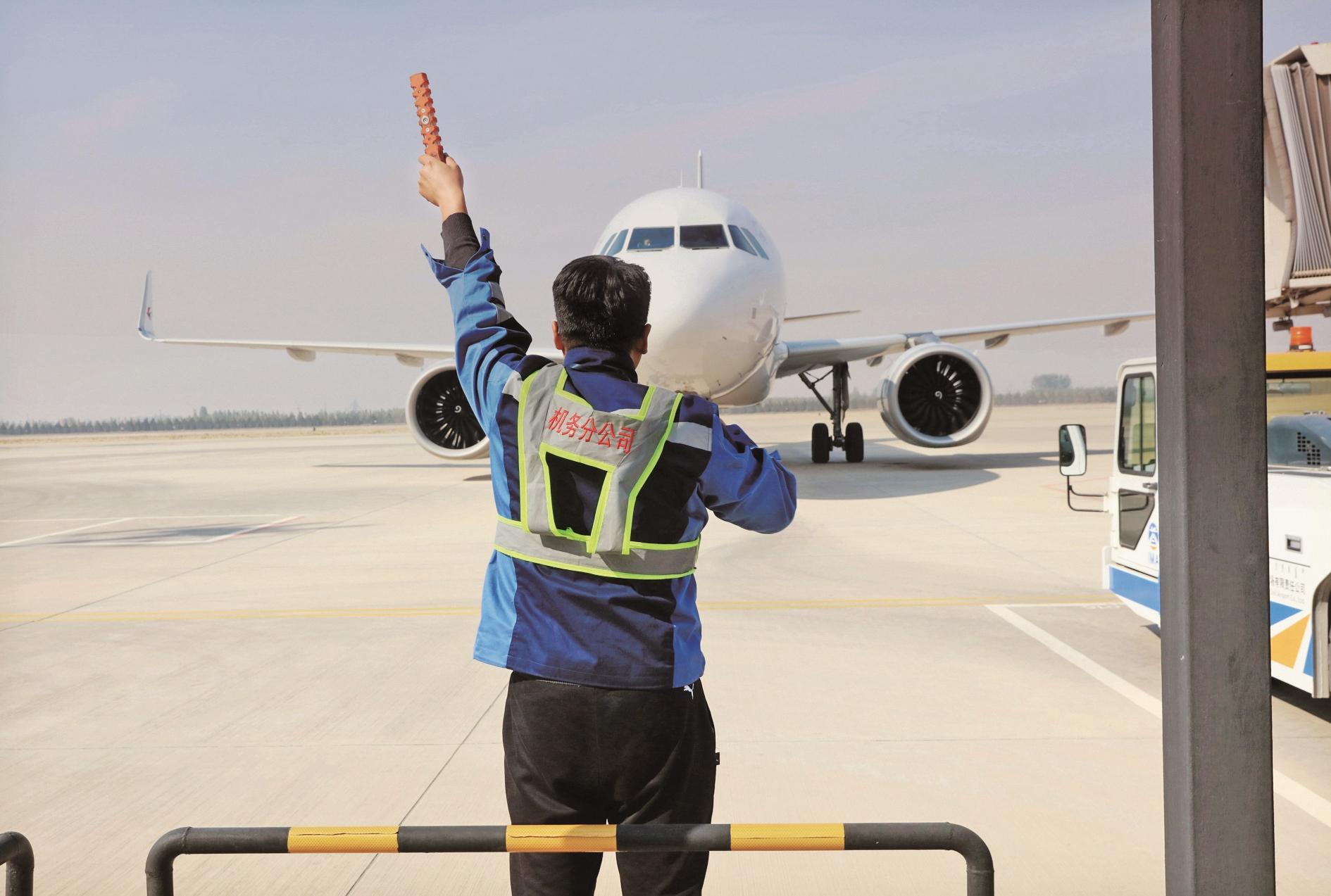 乌海机场清晨航班地面引航员引导飞机进港泊位,机场跑道在黎明中黄白分明,塔台灯光闪烁,机声轰鸣。