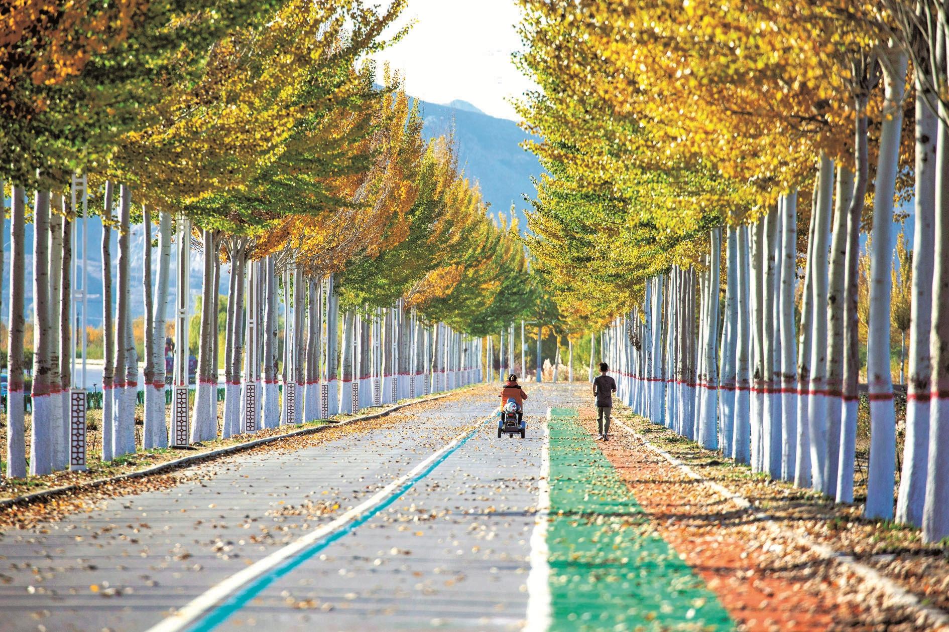公园迎来了清晨的曙光,湖水荡漾,枫叶盈红,杏树叶黄,正以清新的自然风光迎接晨练的人们。