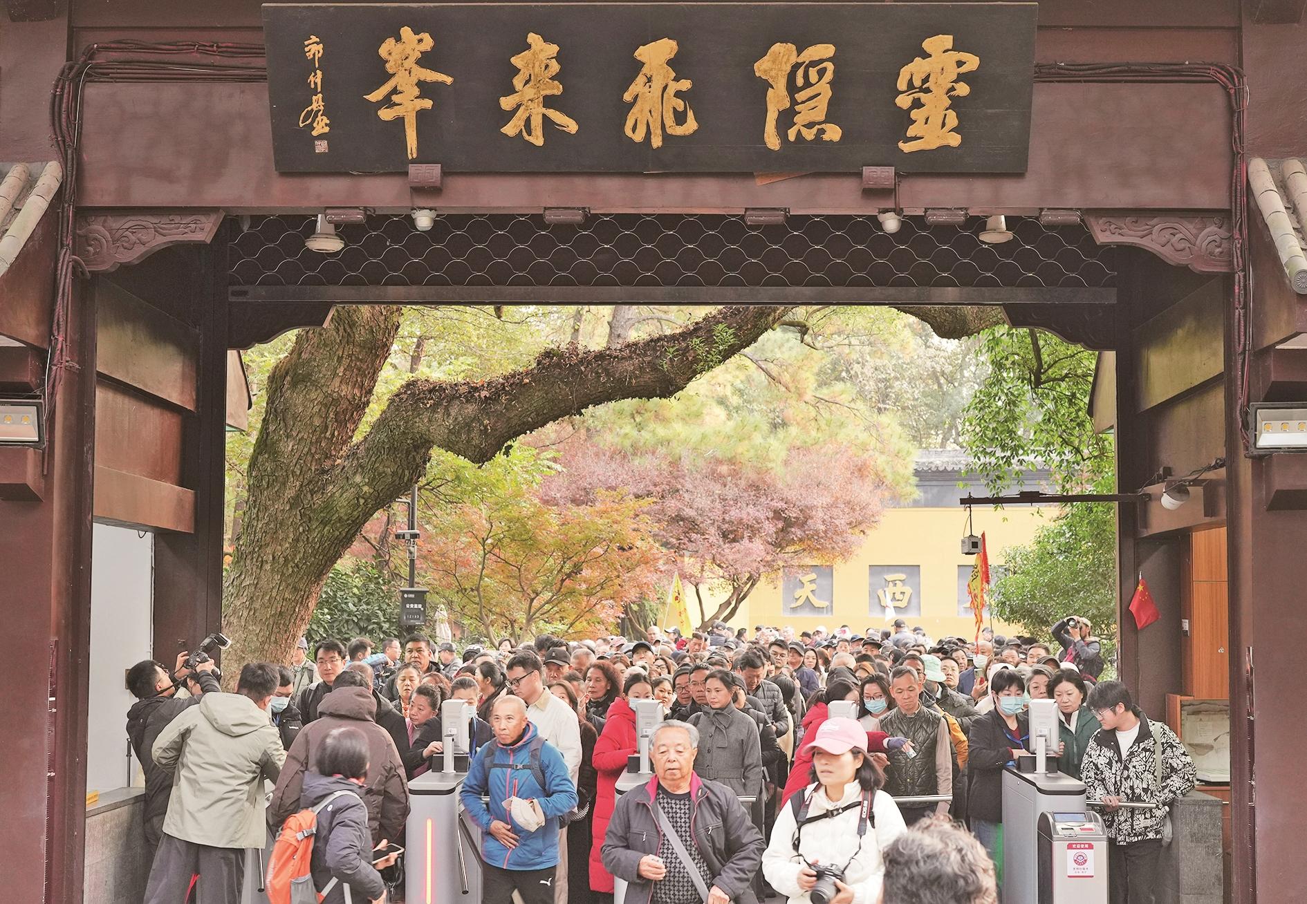 12月1日,首批免票游客验证预约信息后进入灵隐飞来峰景区。12月1日,杭州灵隐飞来峰景区正式开始实行免票政策,向公众免费开放。此次免票范围涵盖整个灵隐飞来峰景区,包括灵隐寺、永福寺、韬光寺等著名文化景点。实行免票政策后,游客按照“实名预约、分时游览”的制度有序进入景区游览。 新华社记者 翁忻旸 摄