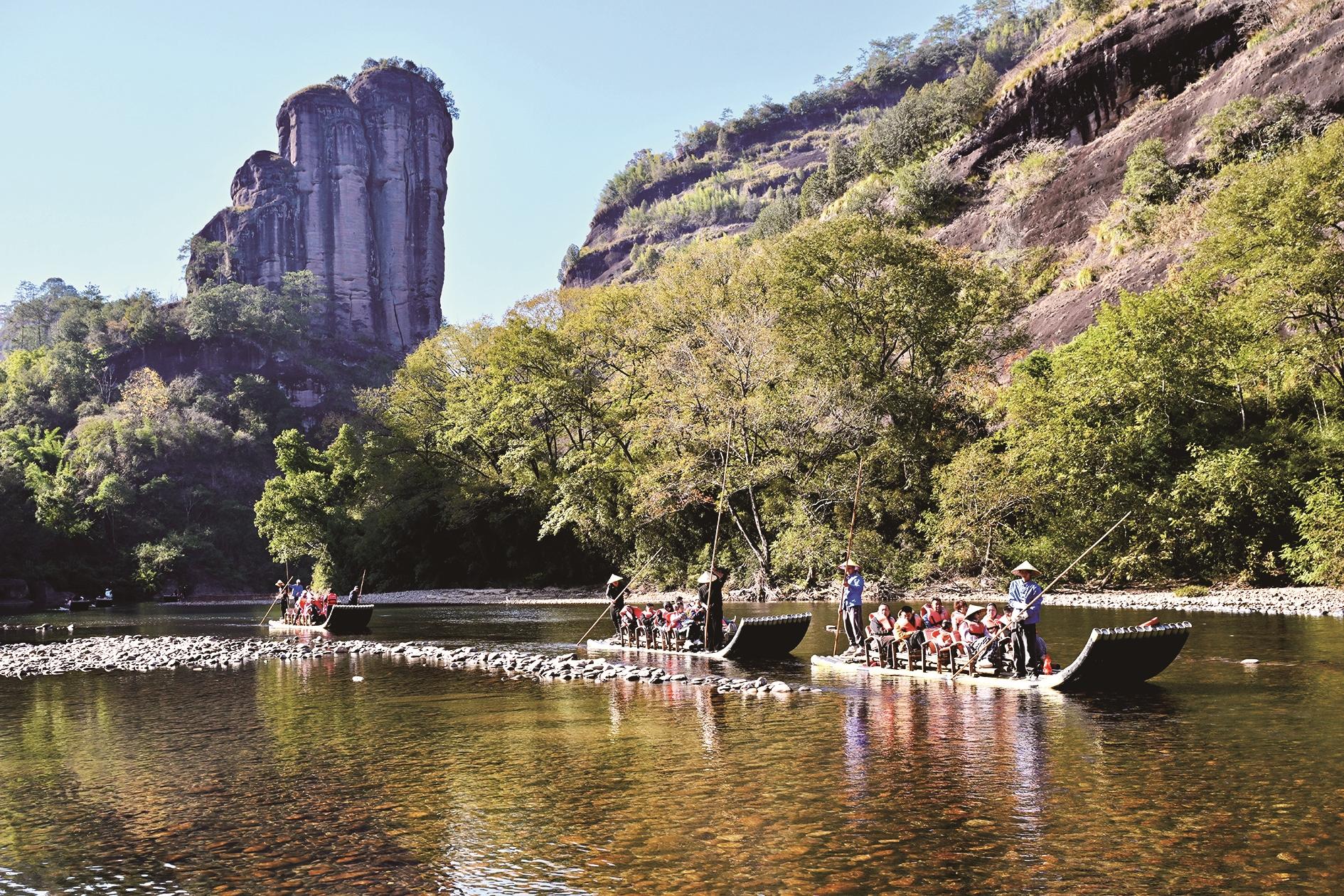 11月30日,游客乘竹筏游览福建武夷山九曲溪。近日,福建武夷山天蓝水碧,绿水青山中色彩斑斓的枫树、水杉等林木点缀其间,呈现别样的冬日景致,吸引游客前来旅游休闲。 新华社记者 姜克红 摄